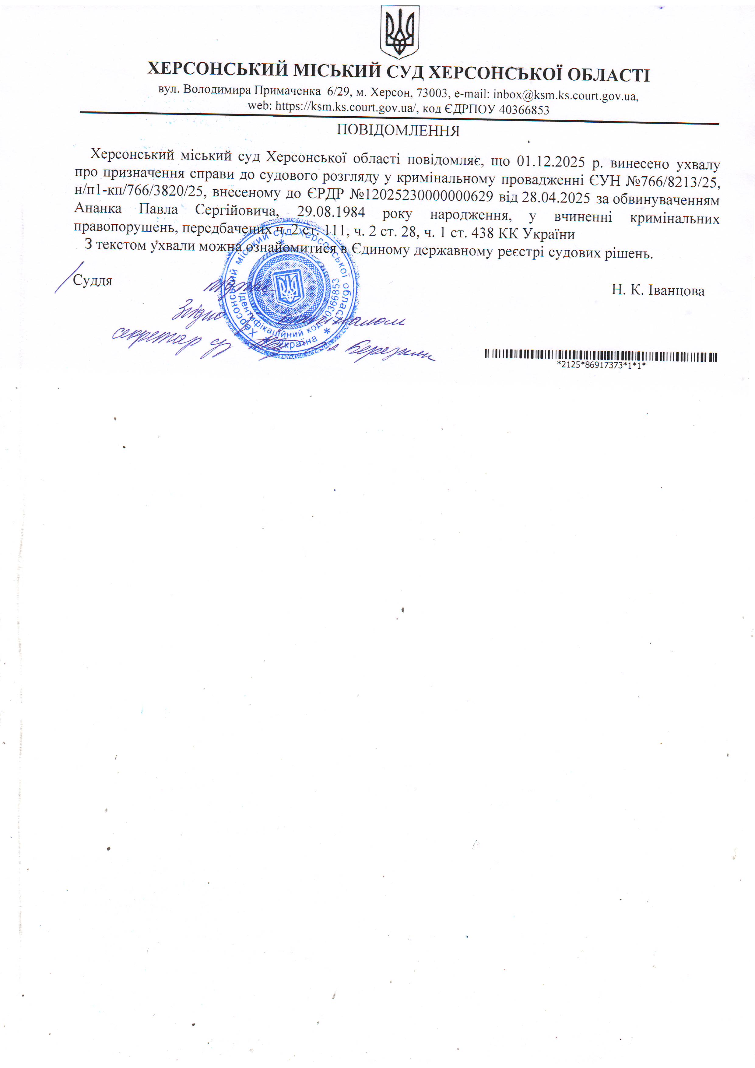 Оголошення для Ананка Павла Сергійовича про винесення ухвали