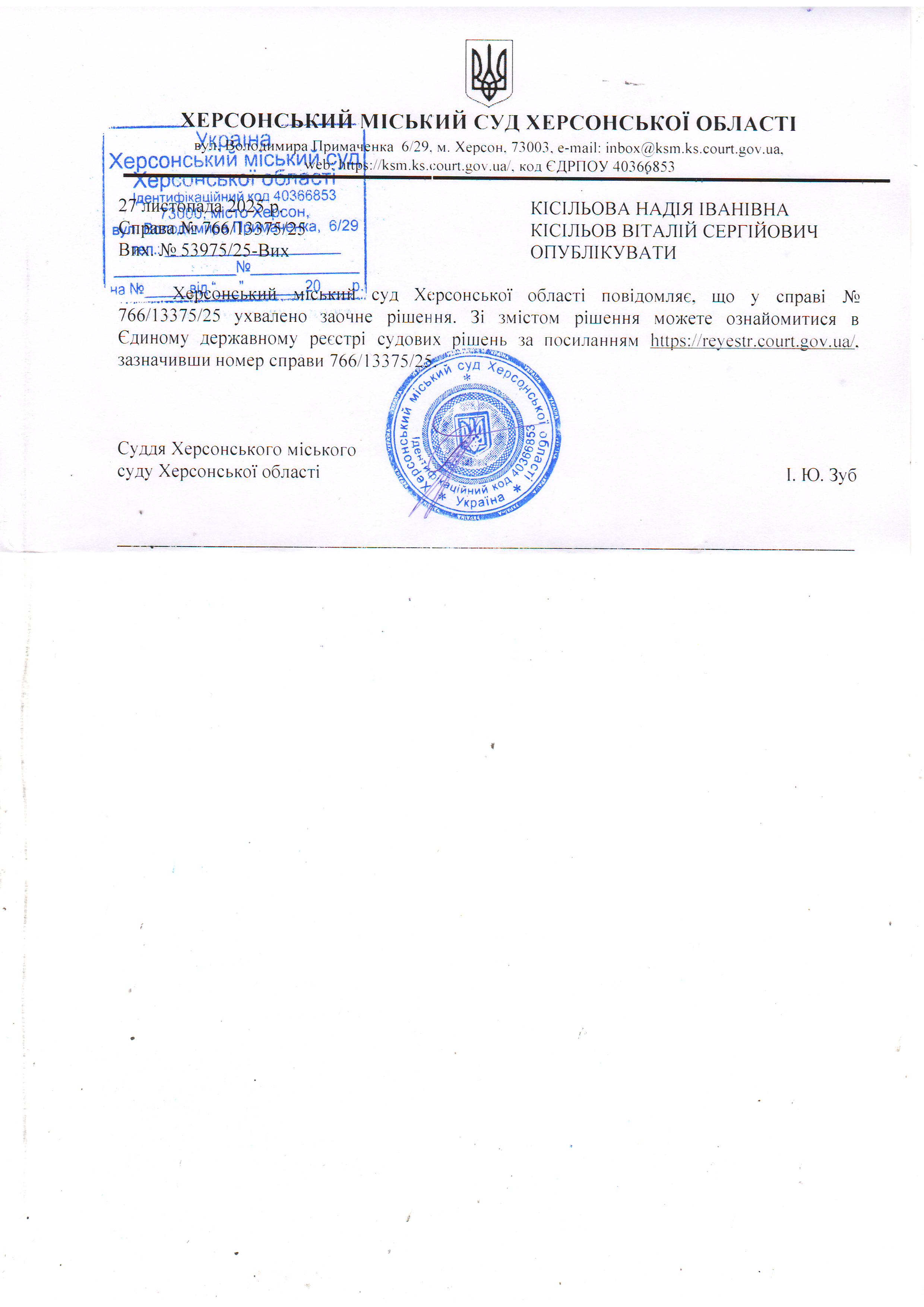 Оголошення для Кісільової Надії Іванівни, Кісільова Віталія Сергійовича про ухвалення заочного рішення