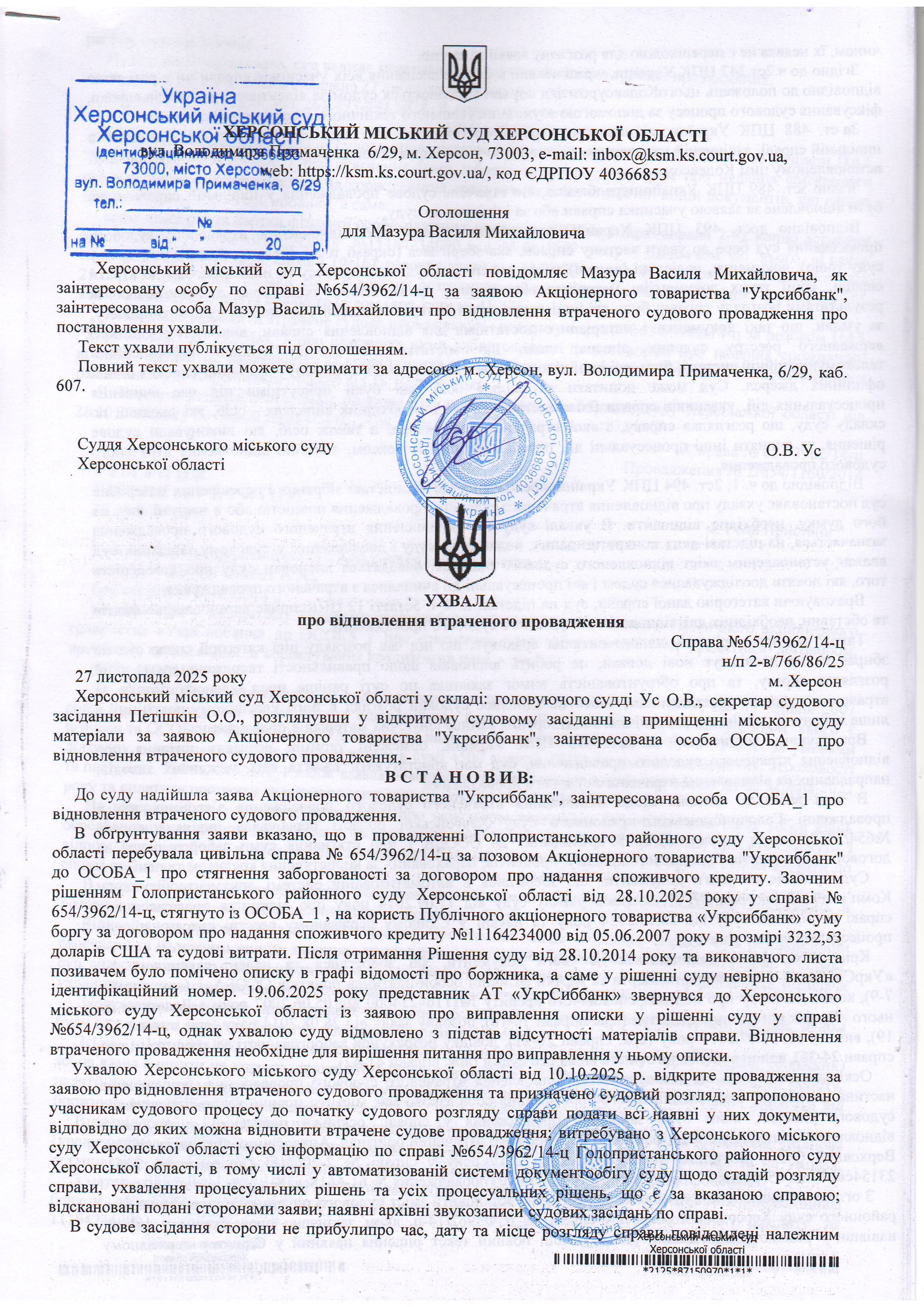 ОГОЛОШЕННЯ, УХВАЛИ ТА ЗАОЧНІ РІШЕННЯ