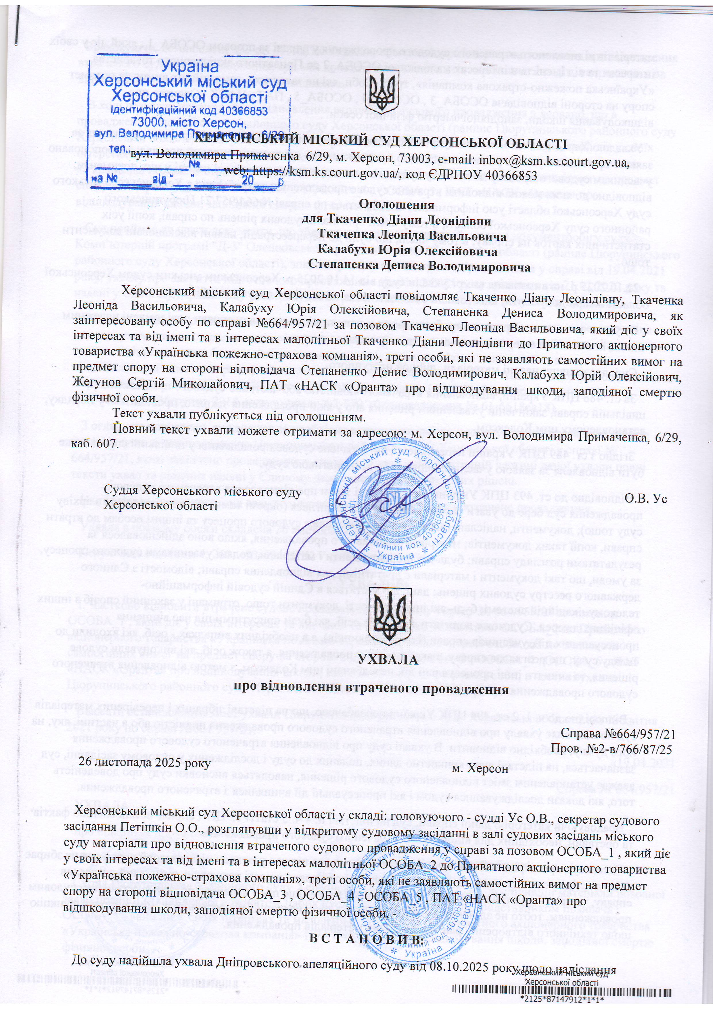 Оголошення для Ткаченко Діани Леонідівни, Ткаченка Леоніда Васильовича, Калабухи Юрія Олексійовича, Степаненка Дениса Володимировича