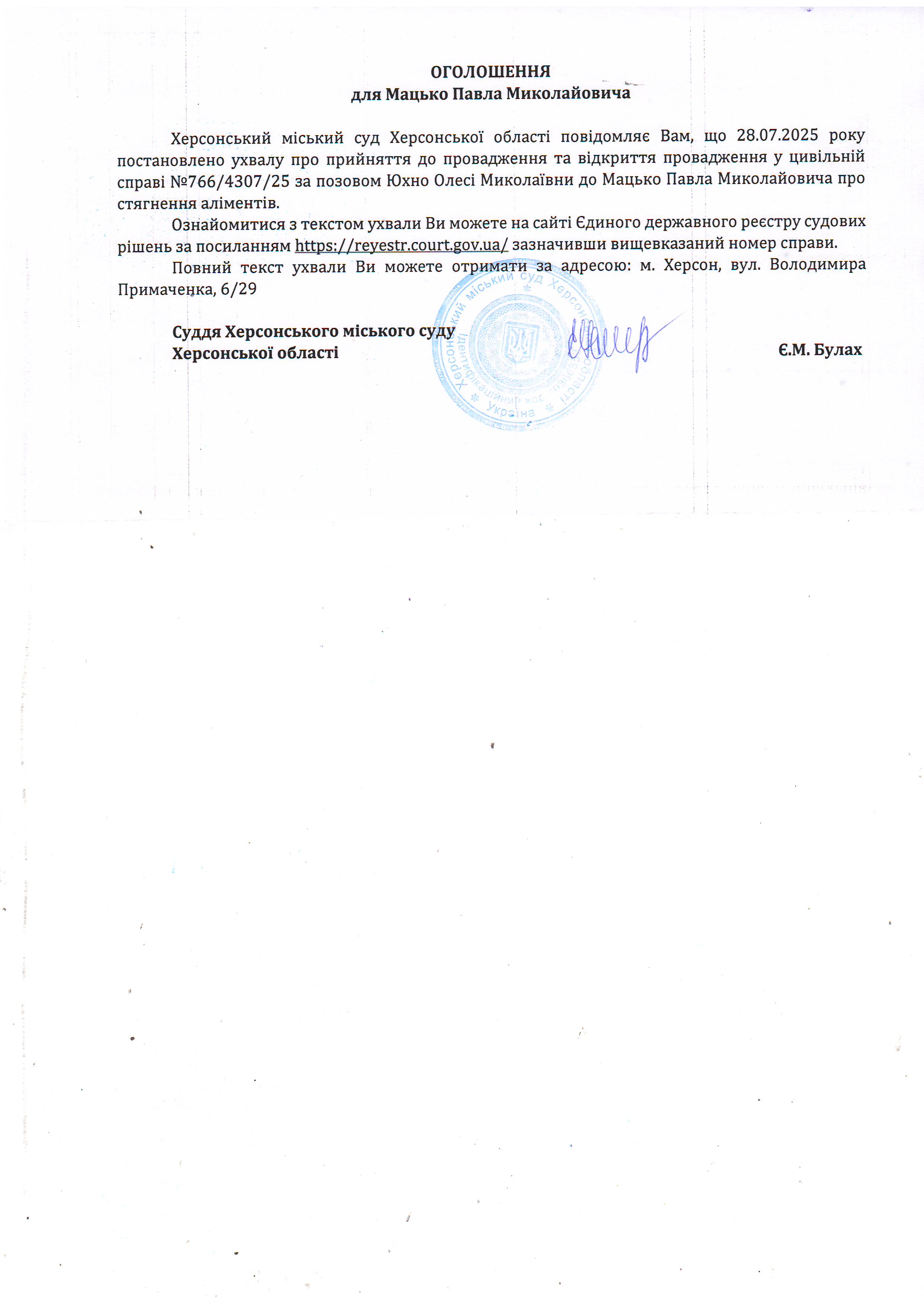 Оголошення для Мацька Павла Миколайовича про постановлення ухвали