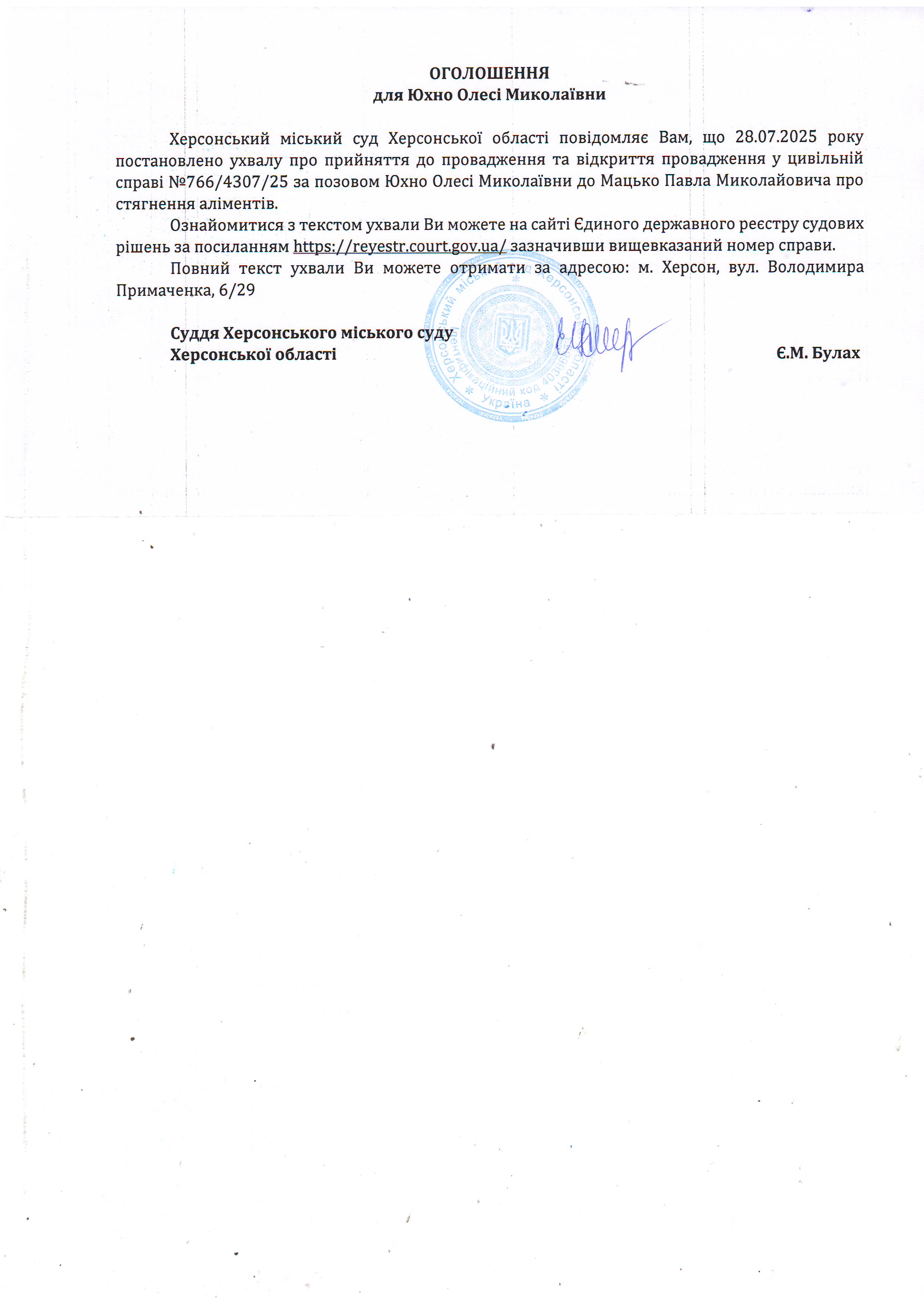 Оголошення для Юхно Олесі Миколаївни про постановлення ухвали
