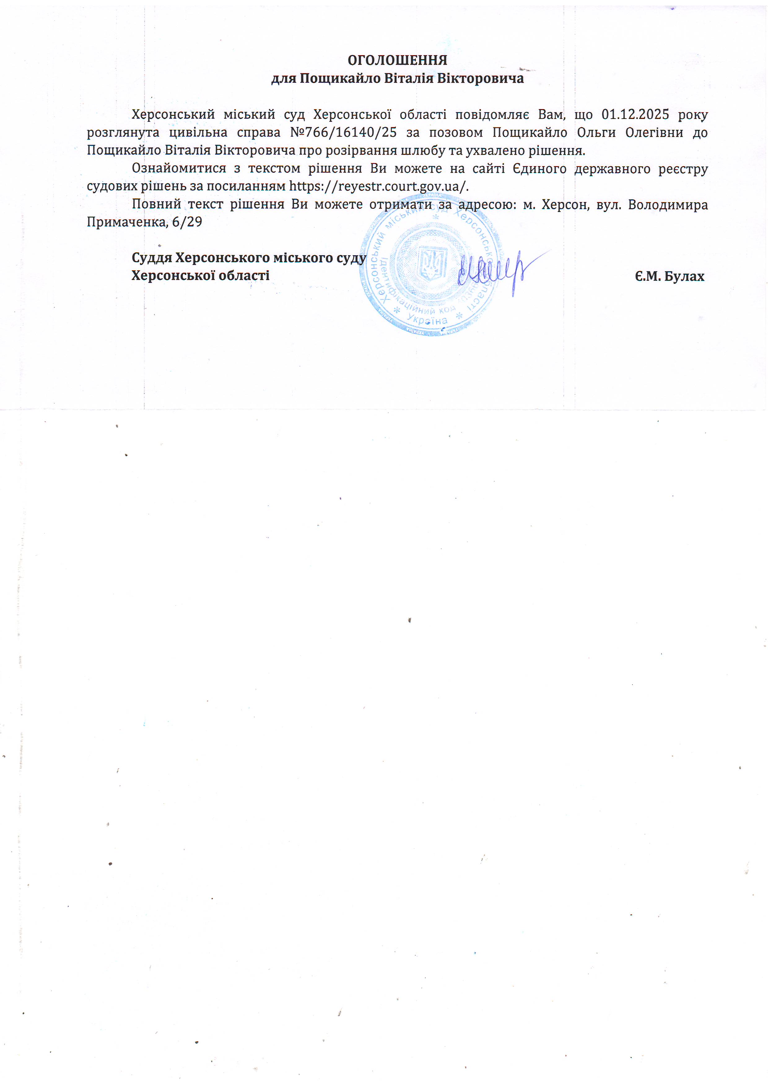 Оголошення для Пощикайла Віталія Вікторовича про ухвалення рішення