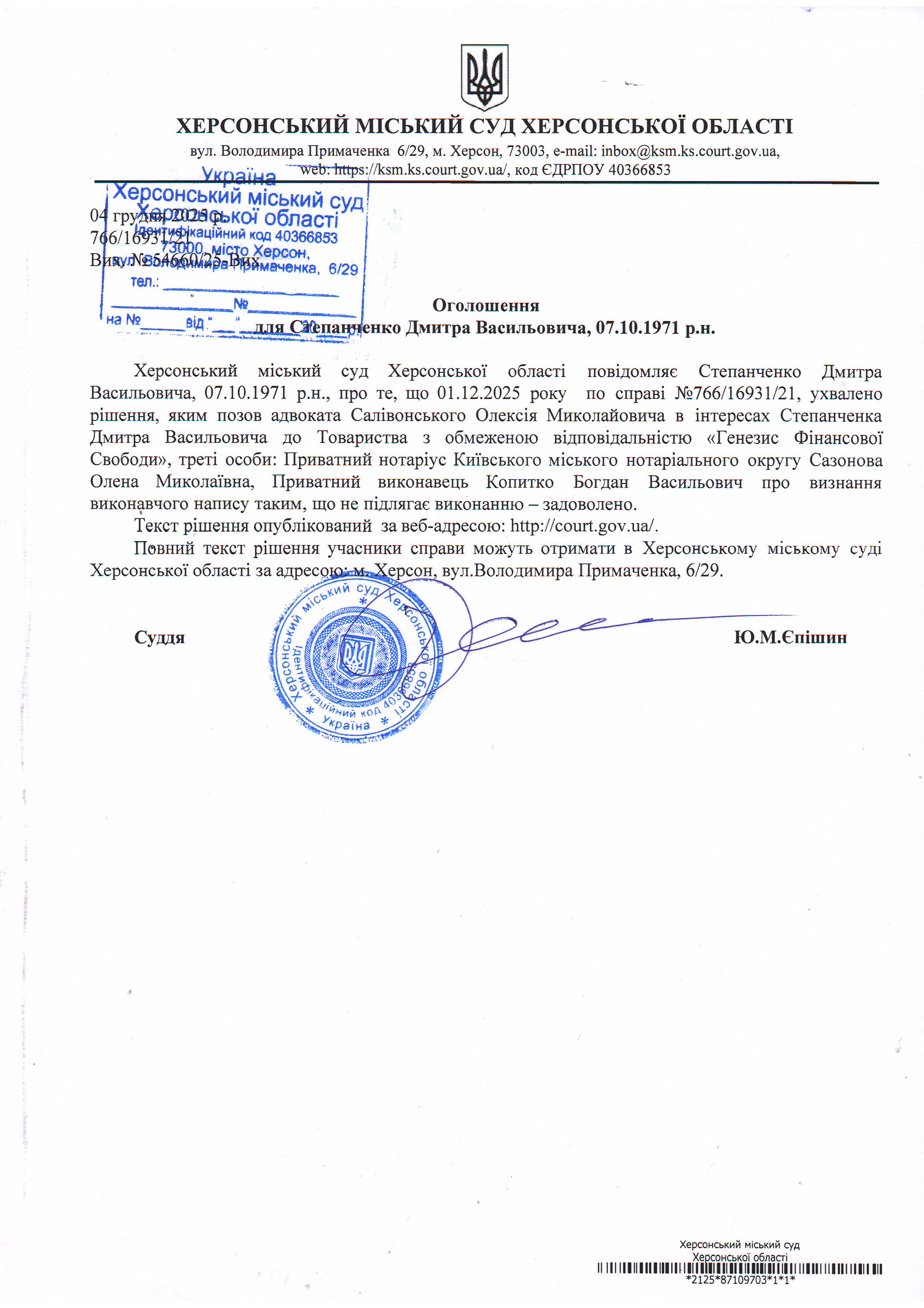 Оголошення для Степанченка Дмитра Васильовича про ухвалення рішення
