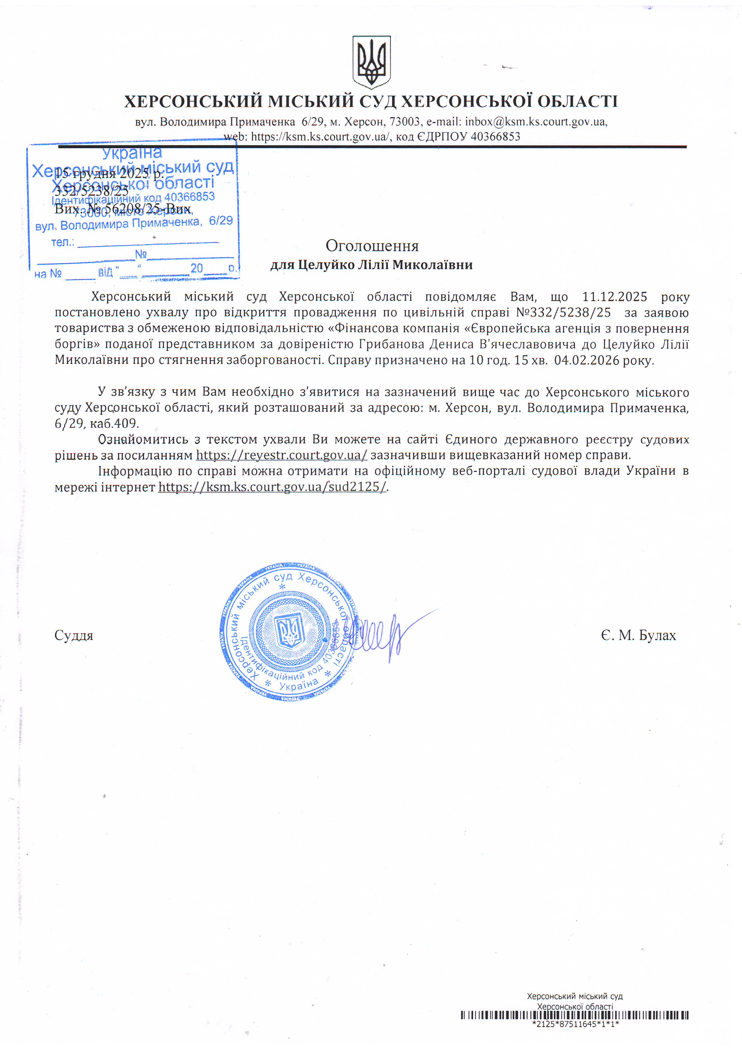 Оголошення для Целуйко Лілії Миколаївни про постановлення ухвали