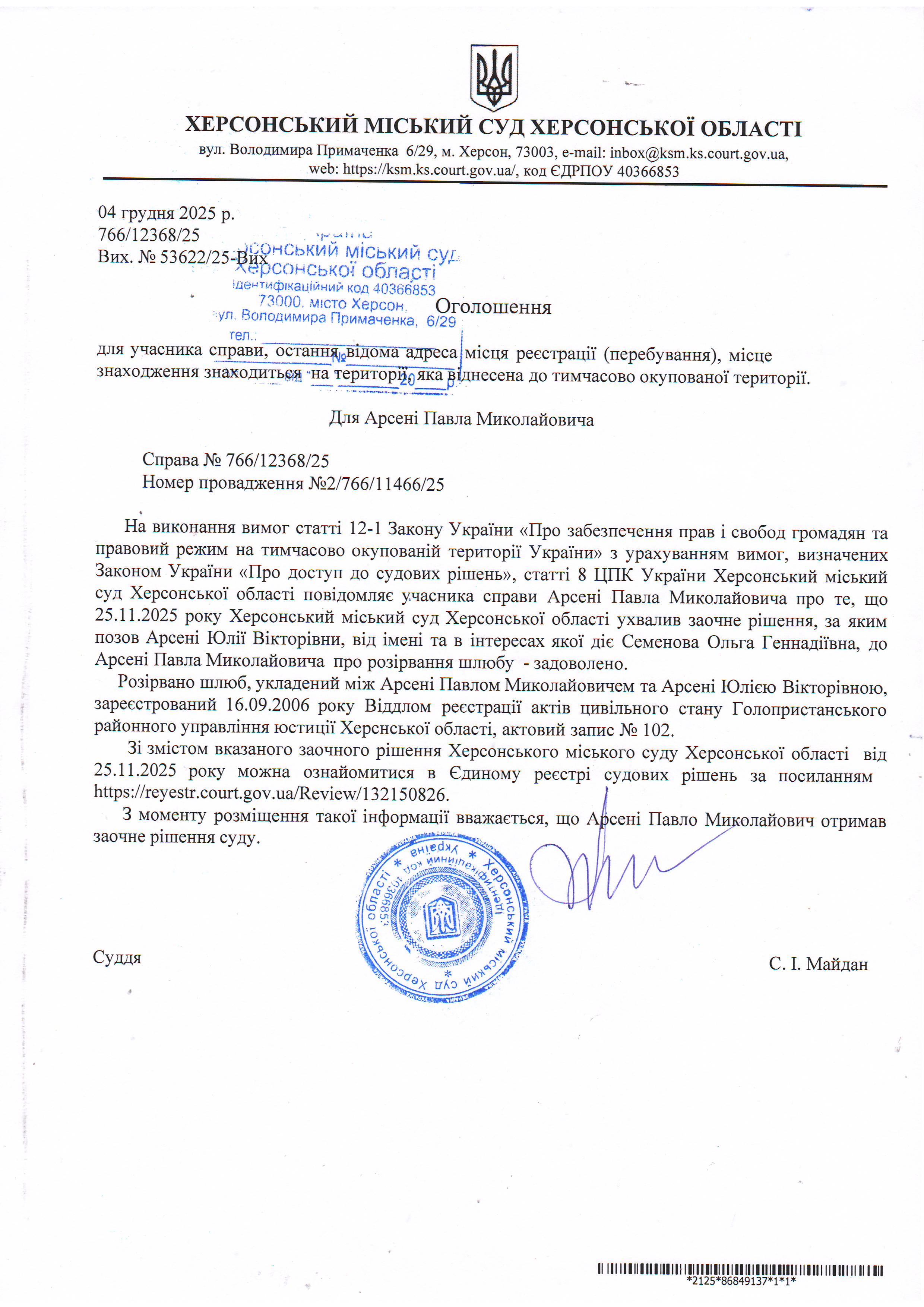 Оголошення для Арсені Павла Миколайовича про ухвалення заочного рішення