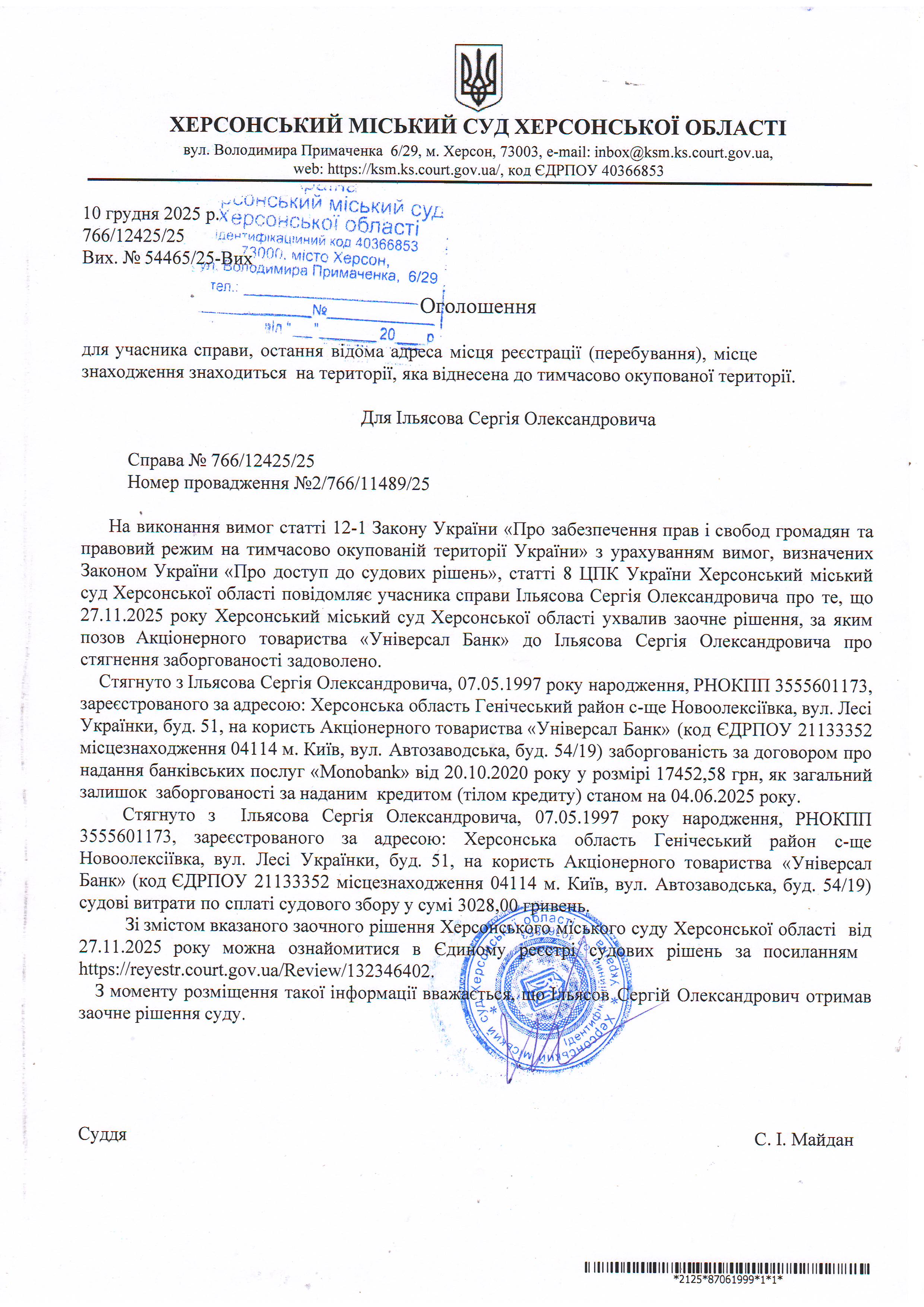 Оголошення для Ільясова Сергія Олександровича про ухвалення заочного рішення