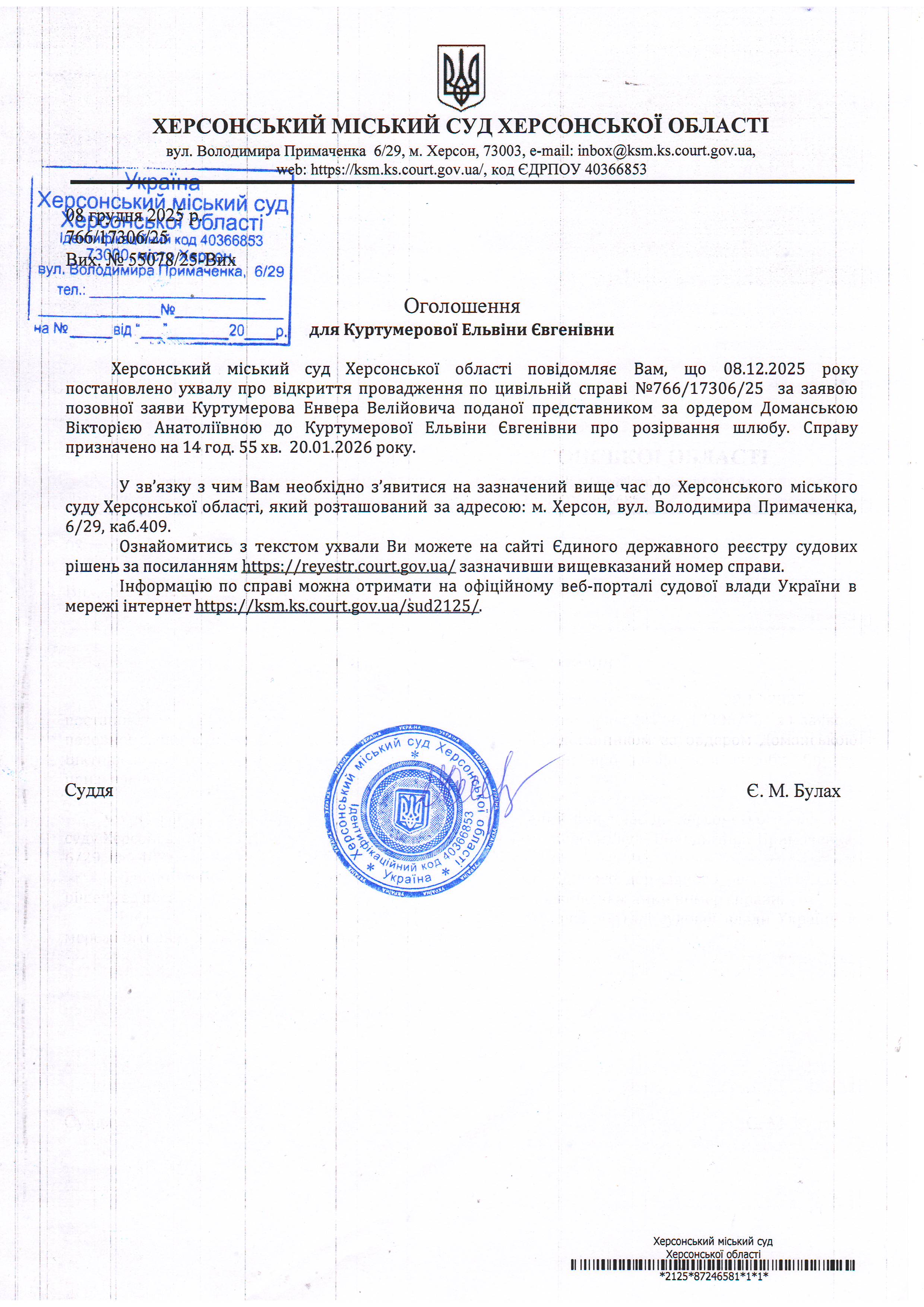Оголошення для Куртумерової Ельвіни Євгенівни про постановалення ухвали