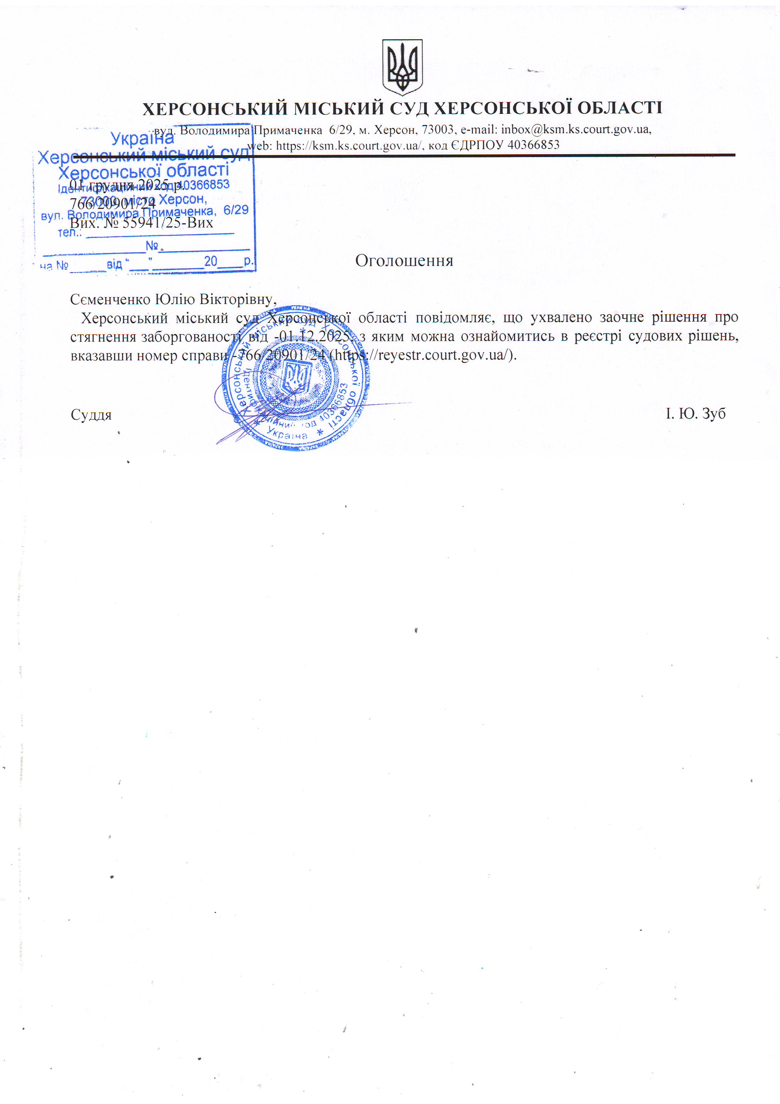 Оголошення для Сєменченко Юлії Вікторівни про ухвалення заочного рішення