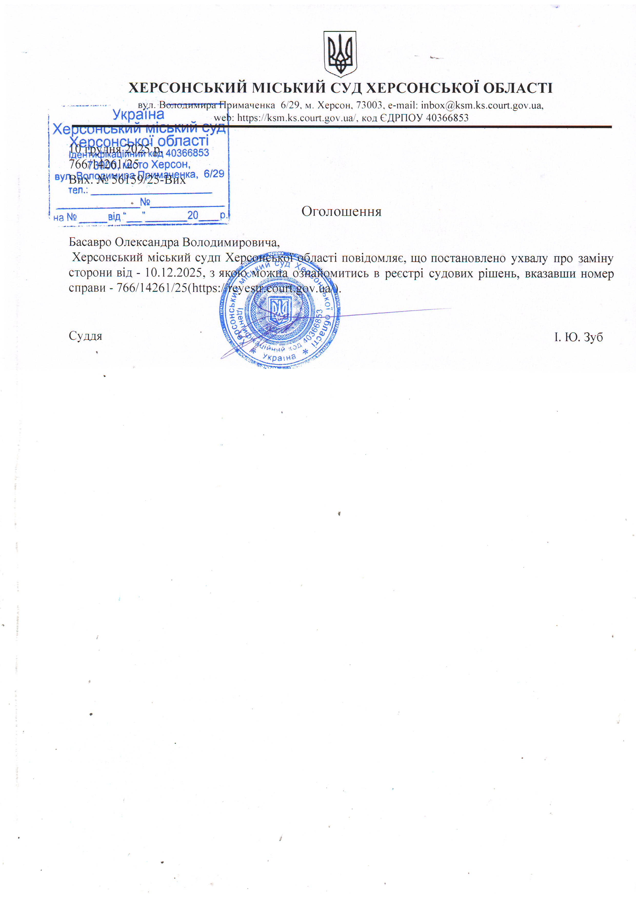 Оголошення для Басавро Олександра Володимировича про постановлення ухвали