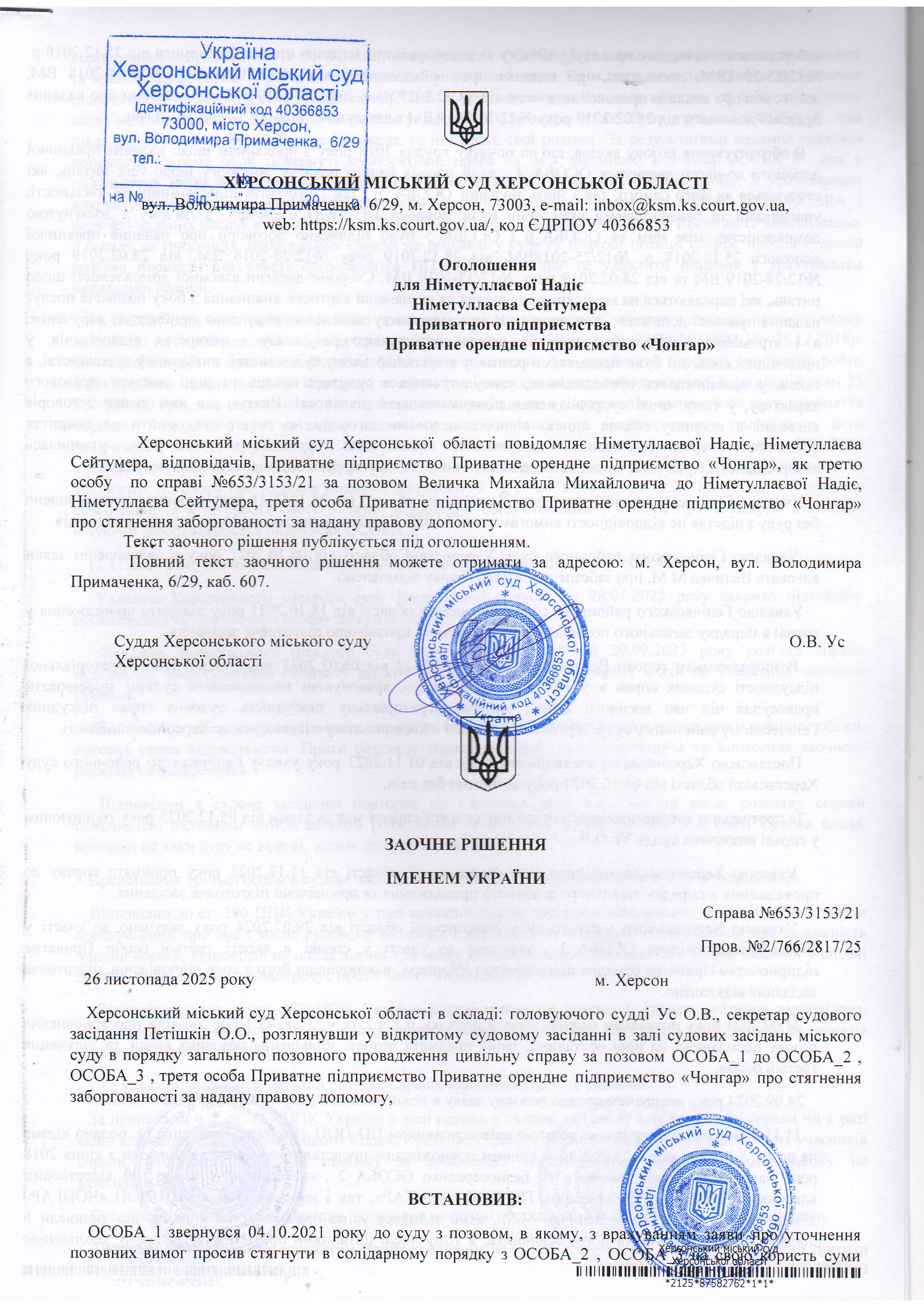 Оголошення для Німетуллаєвої Надіє, Німетуллаєва Сейтумера, ПП "Приватне орендне підприємство "Чонгар"