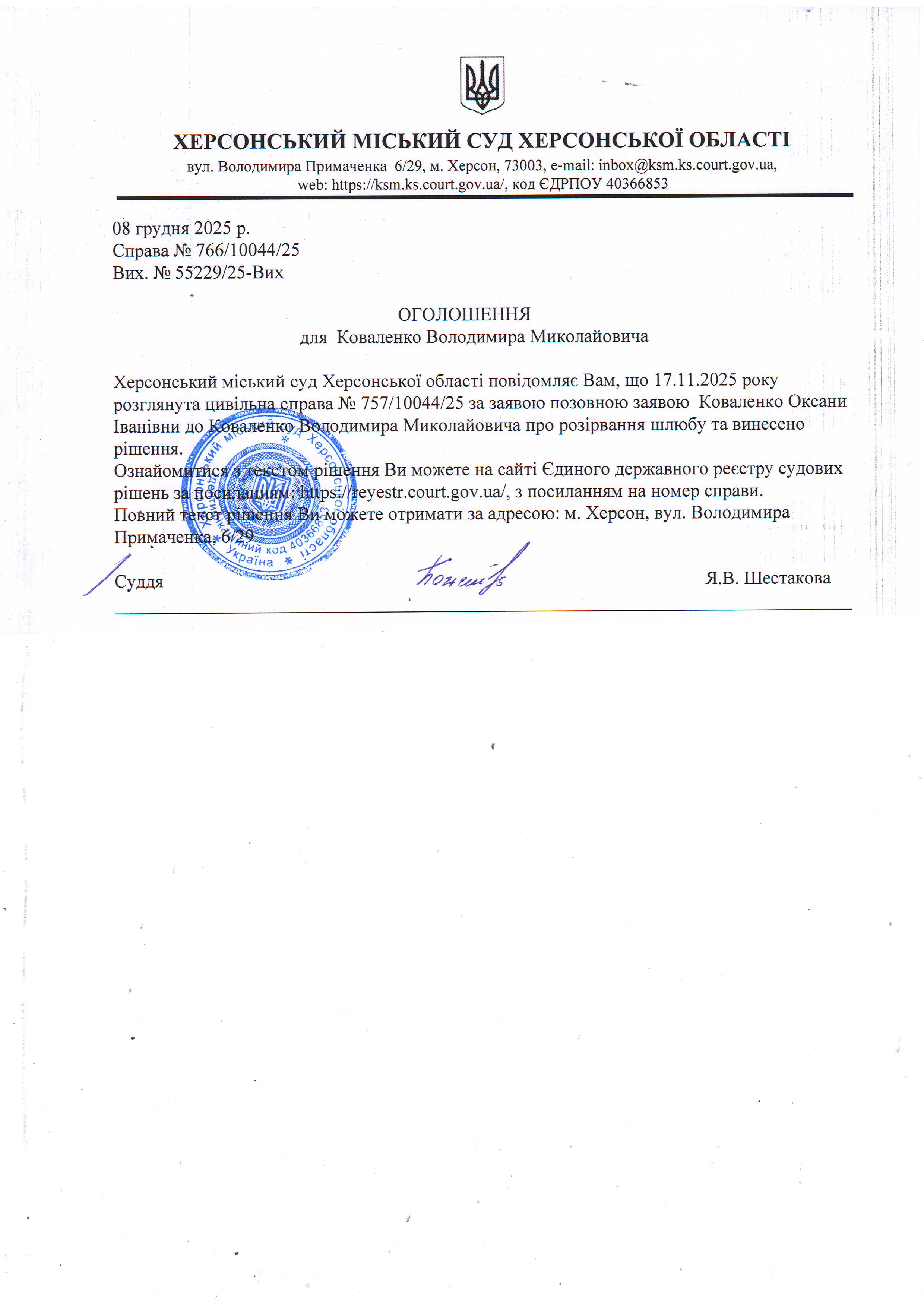 Оголошення для Коваленка Володимира Миколайовича про винесення рішення