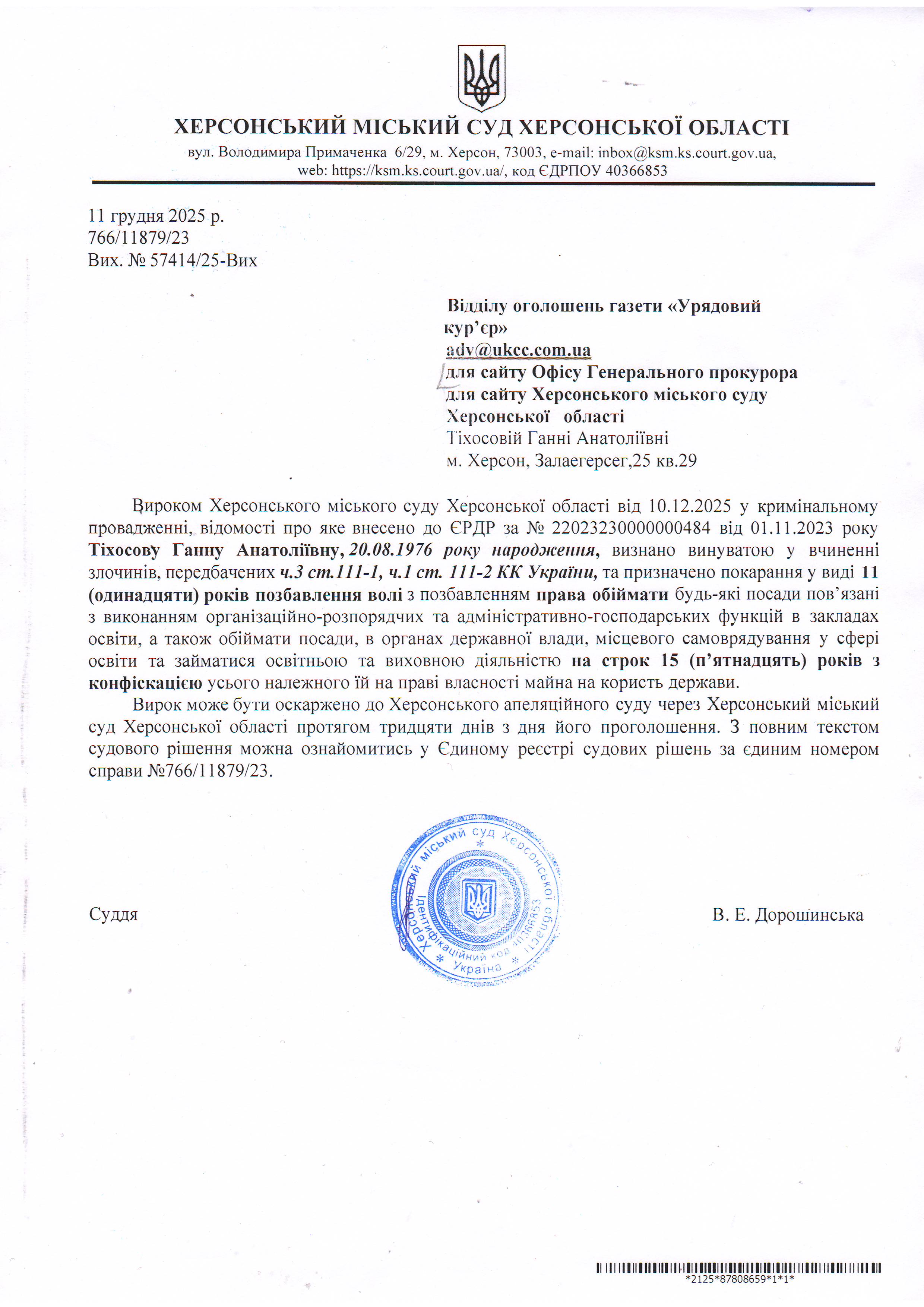 Оголошення для Тіхосової Ганни Анатоліївни про винесення вироку