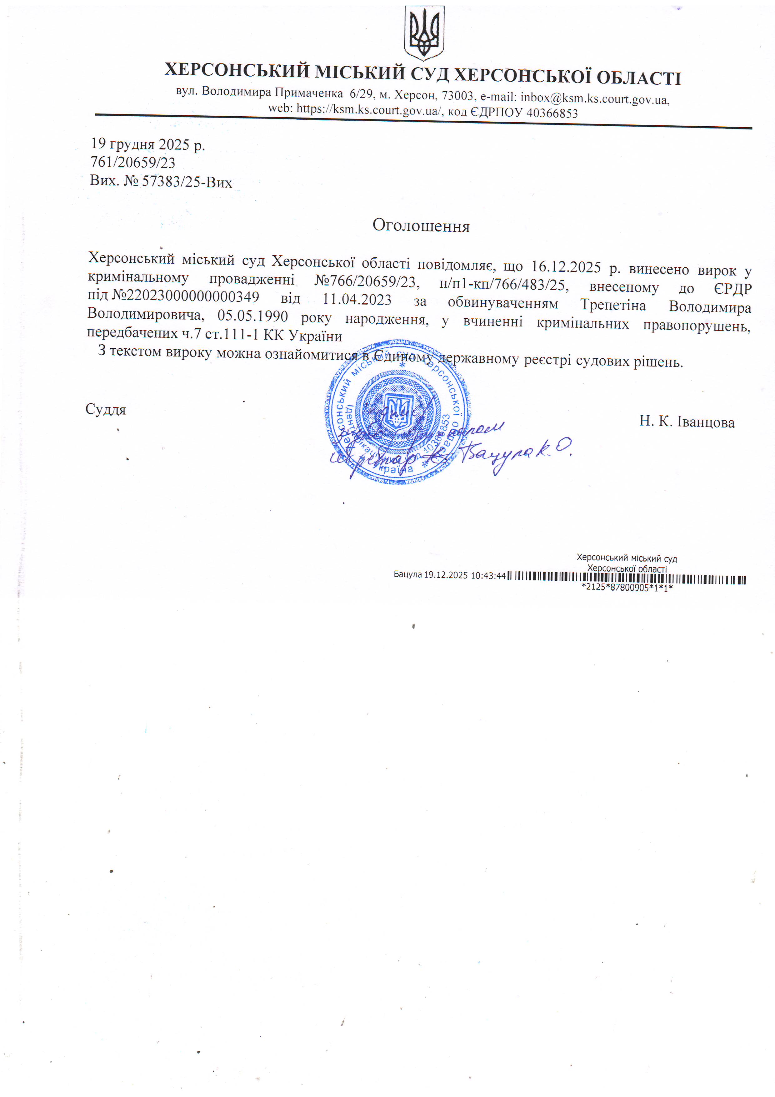 Оголошення для Трепетіна Володимира Володимировича про винесення вироку