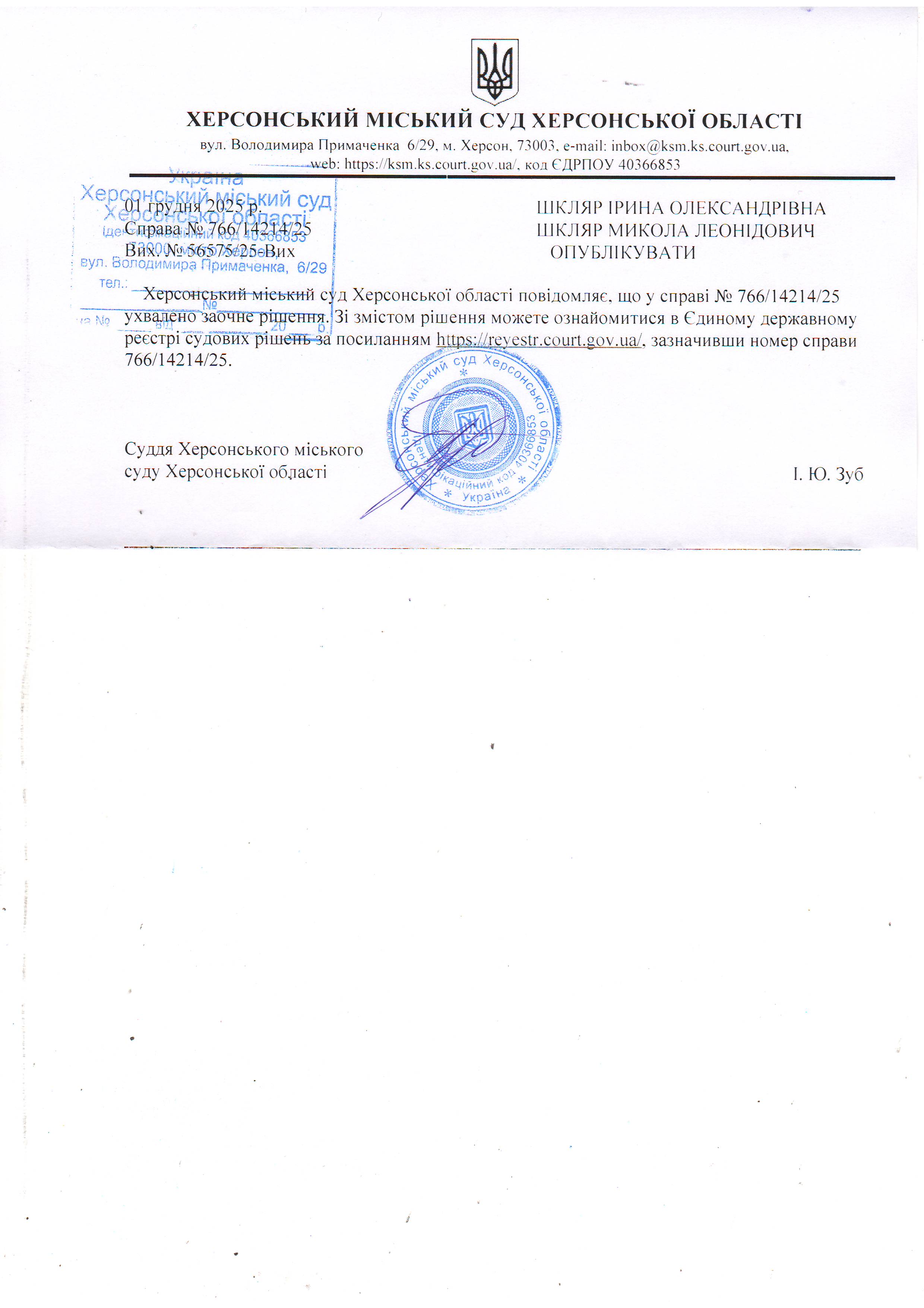 Оголошення для Шкляр Ірини Олександрівни, Шкляр Миколи Леонідовича про ухвалення заочного рішення