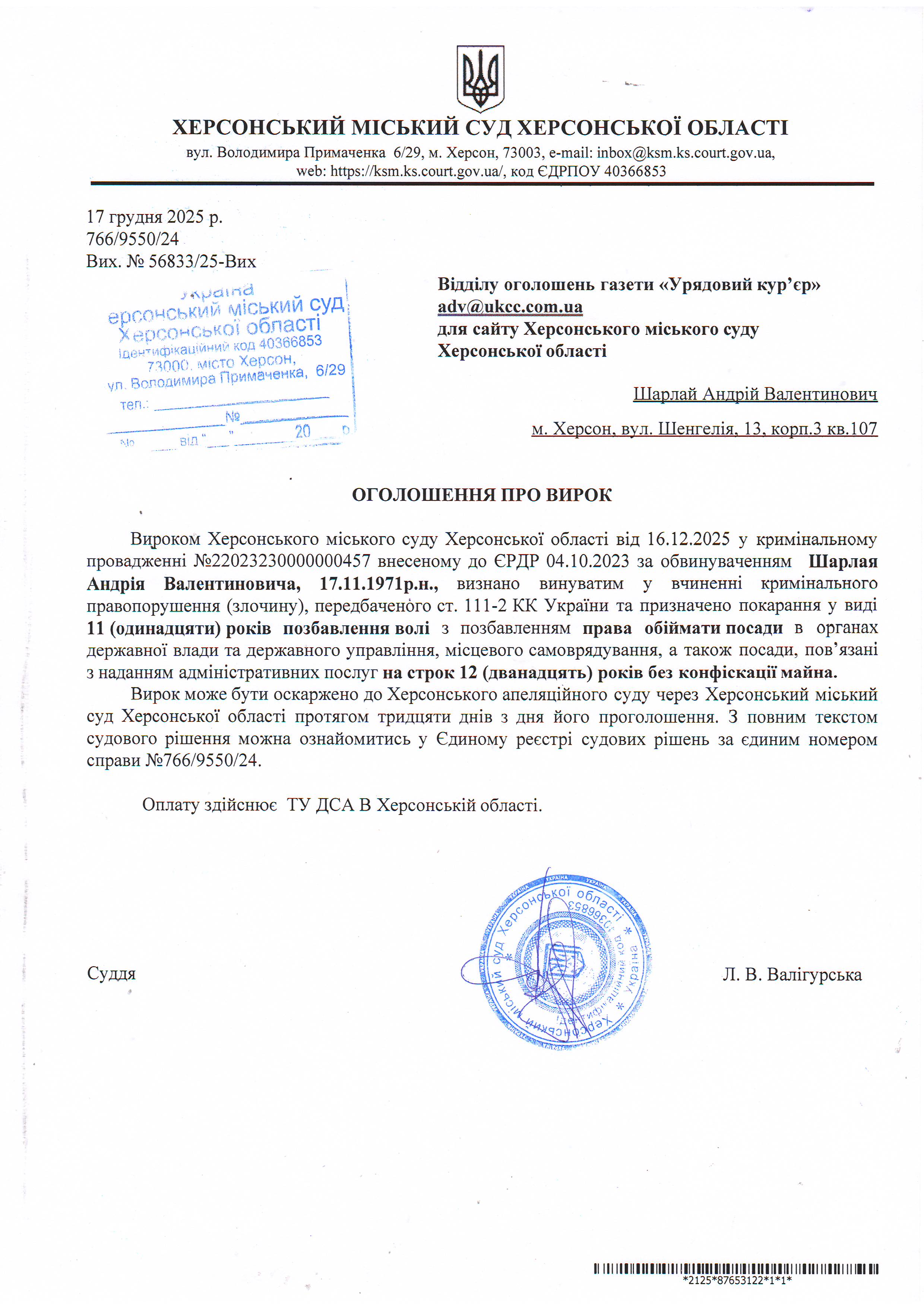 Оголошення для Шарлая Андрія Валентиновича про винесення вироку