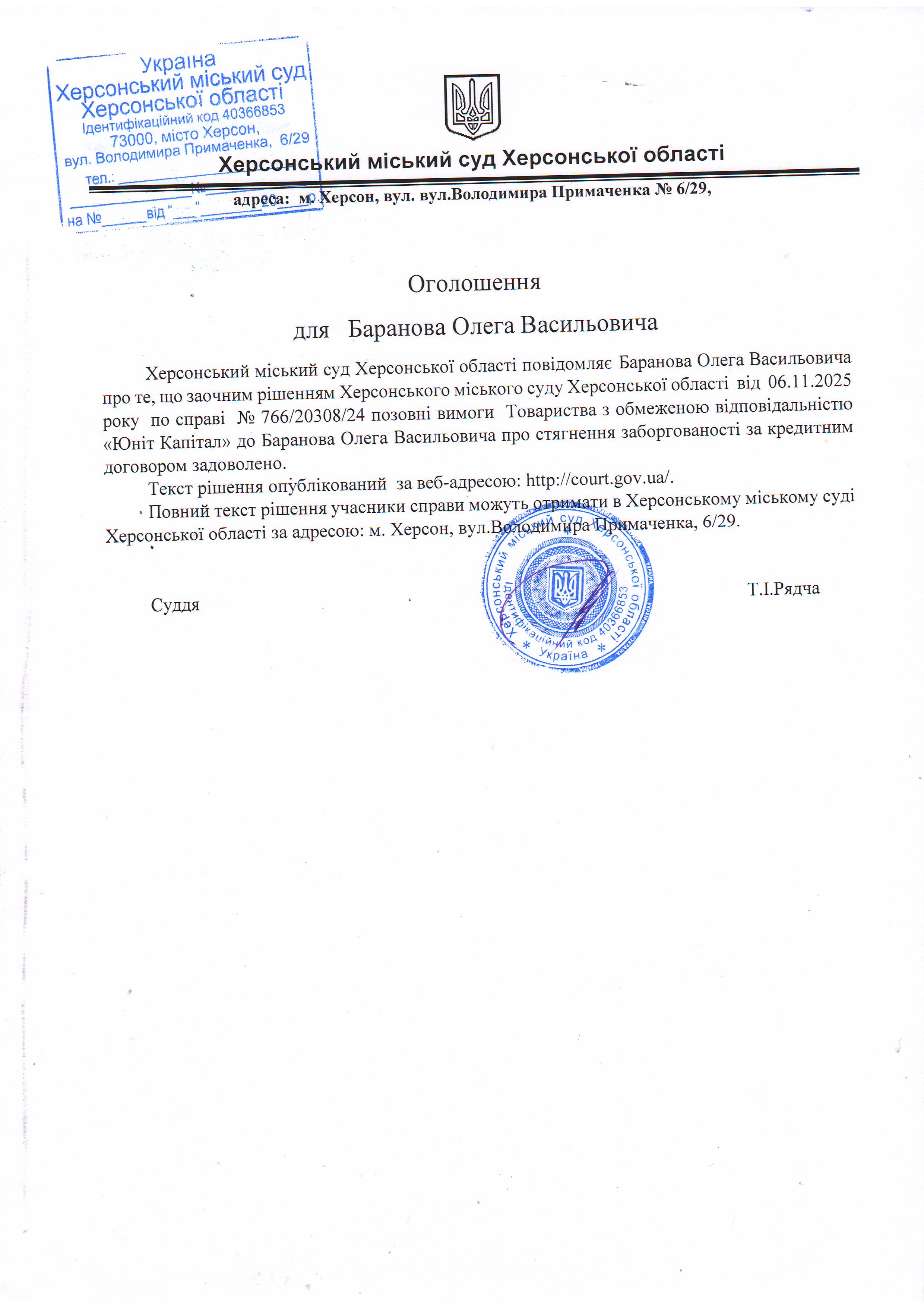 Оголошення про виклик особи в суд та повідомлення про судове рішення