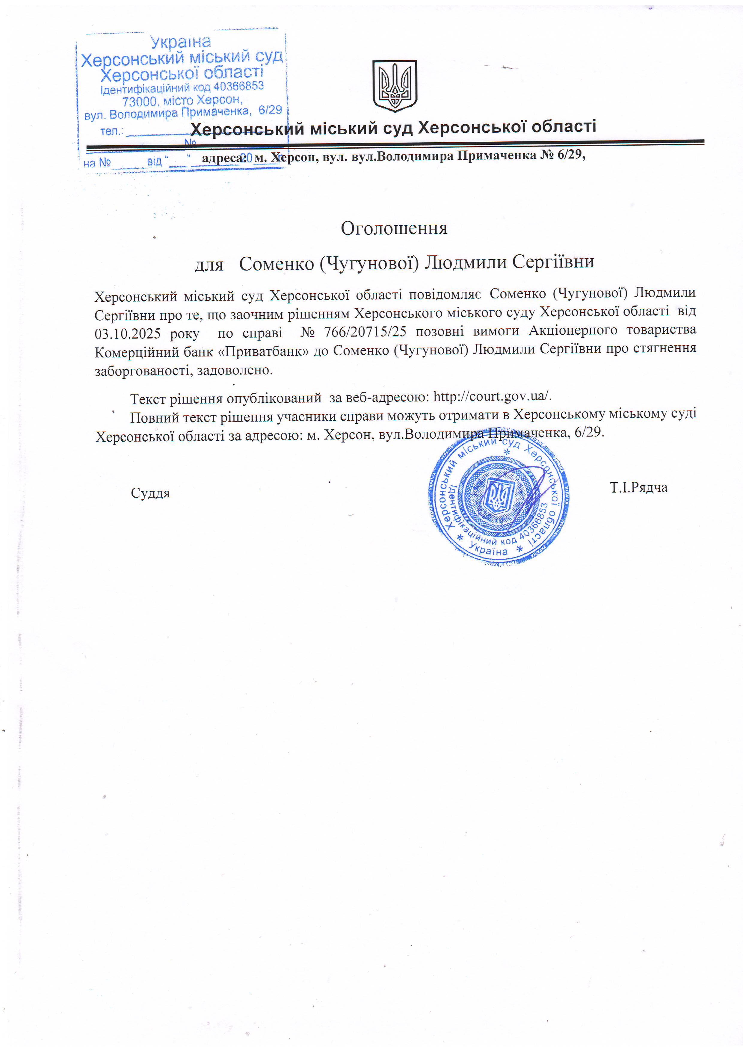 Оголошення для Соменко (Чугунової) Людмили Сергіївни