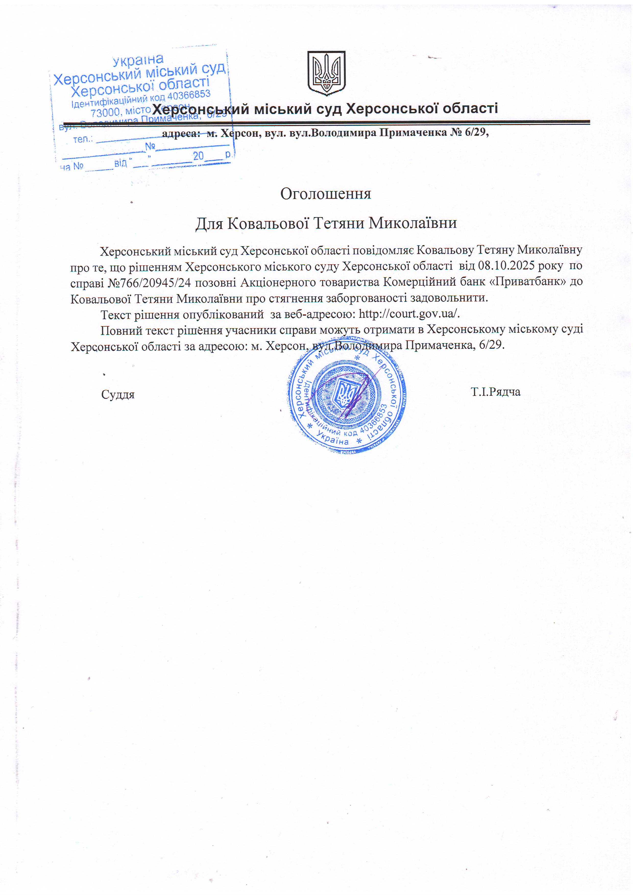 Оголошення для Ковальової Тетяни Миколаївни