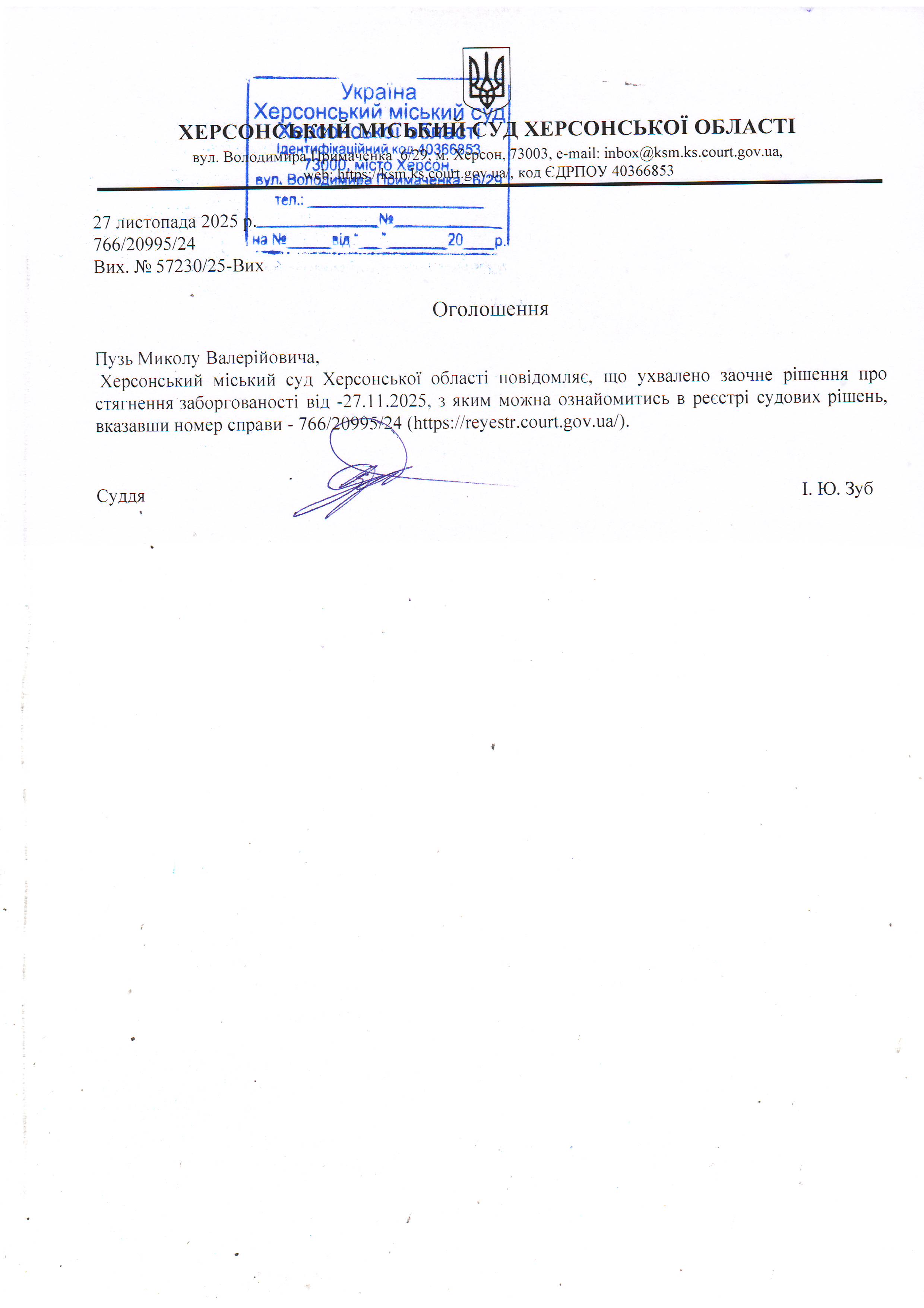 Оголошення для Пузя Миколи Валерійовича про ухвалення заочного рішення