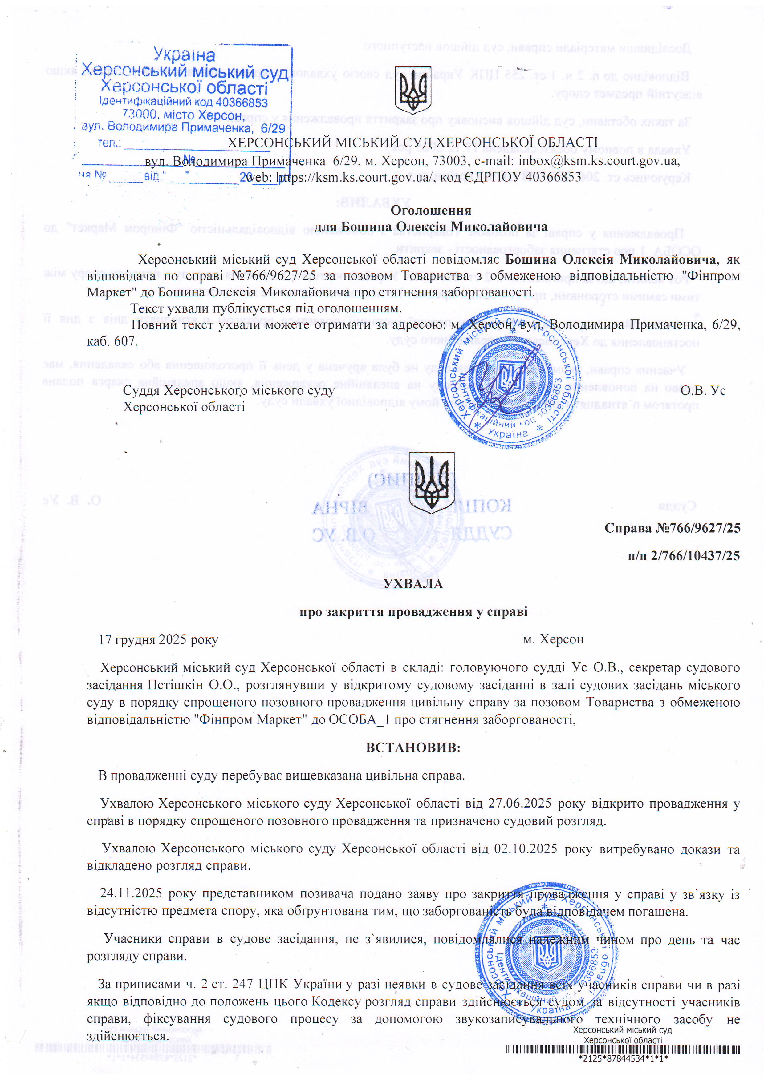 ПОВІДОМЛЕННЯ ПРО РОЗГЛЯД СПРАВИ БЕЗ ВИКЛИКУ СТОРІН
