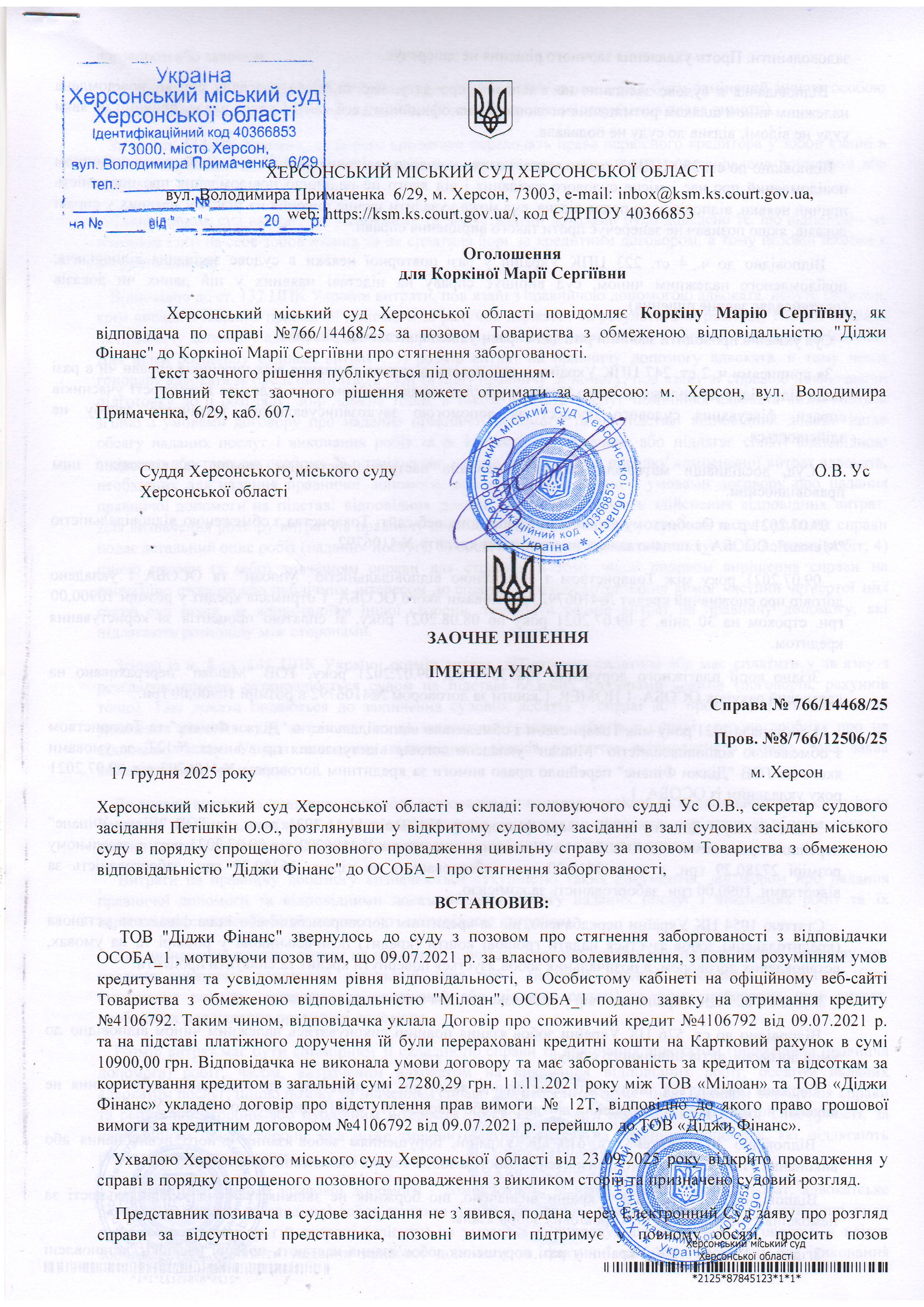 ОГОЛОШЕННЯ, УХВАЛИ ТА ЗАОЧНІ РІШЕННЯ