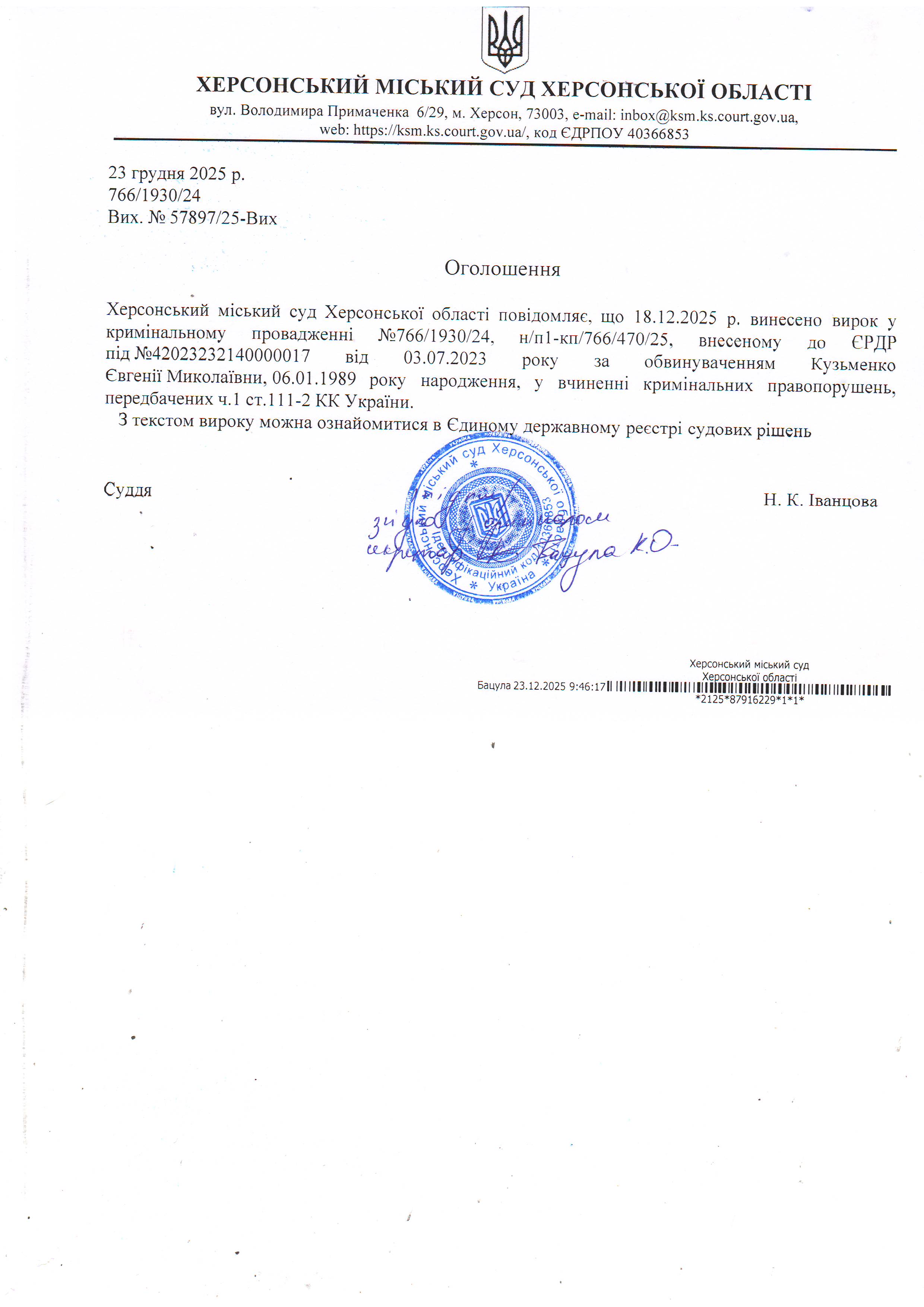 Оголошення для Кузьменко Євгенії Миколаївни про винесення вироку