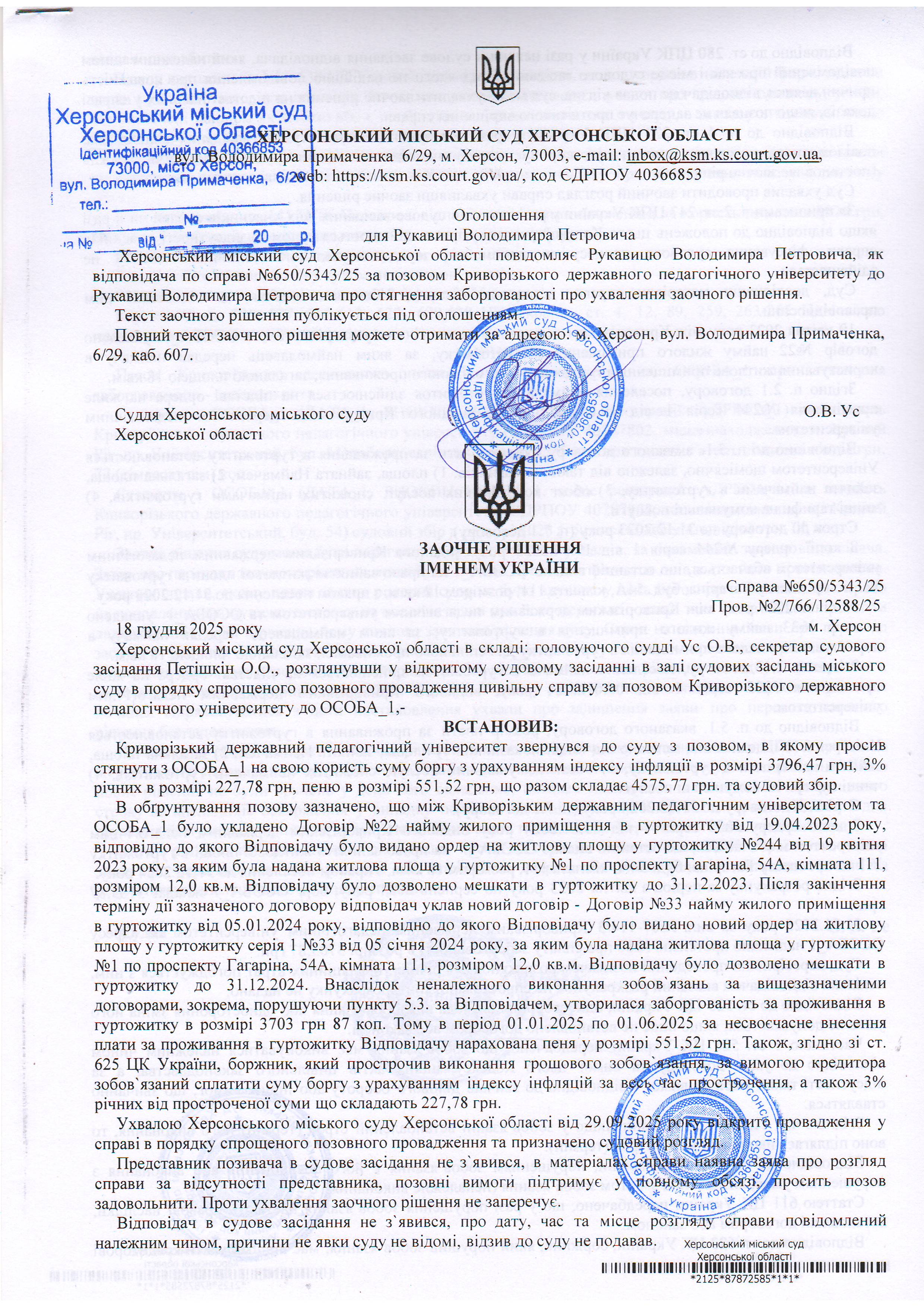 ОГОЛОШЕННЯ, УХВАЛИ ТА ЗАОЧНІ РІШЕННЯ