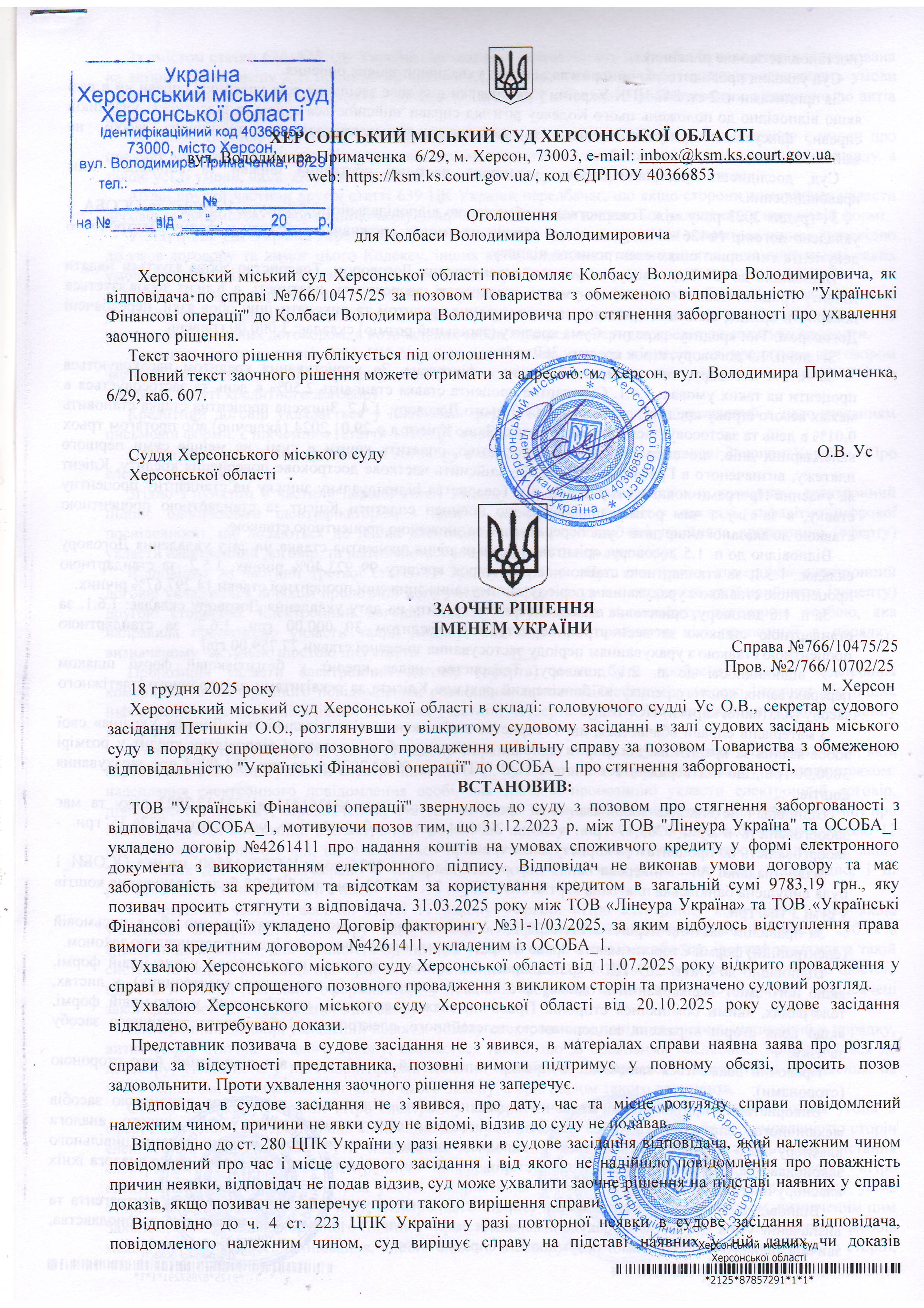ОГОЛОШЕННЯ, УХВАЛИ ТА ЗАОЧНІ РІШЕННЯ