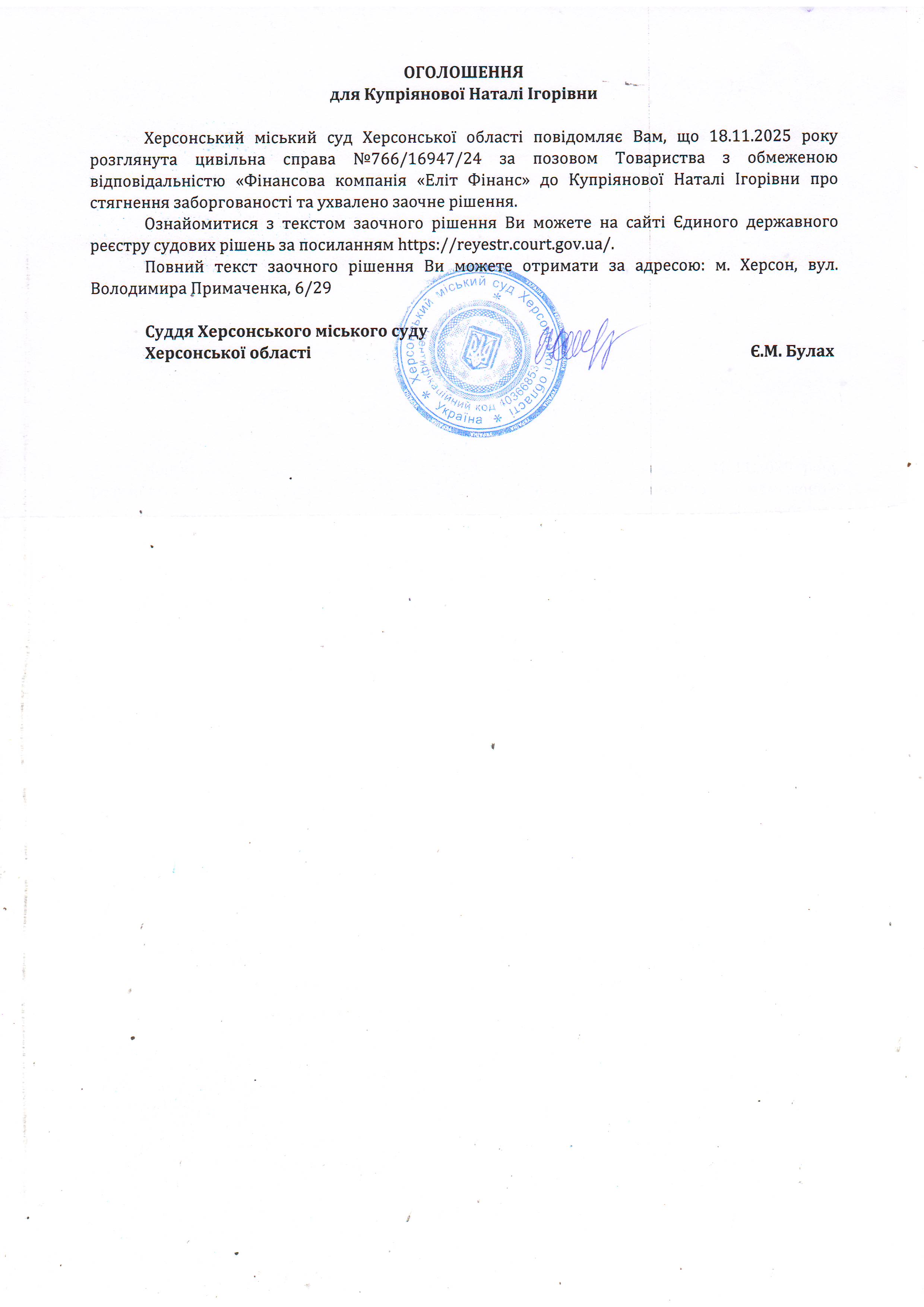 Оголошення для Купріянової Наталі Ігорівни про ухвалення заочного рішення