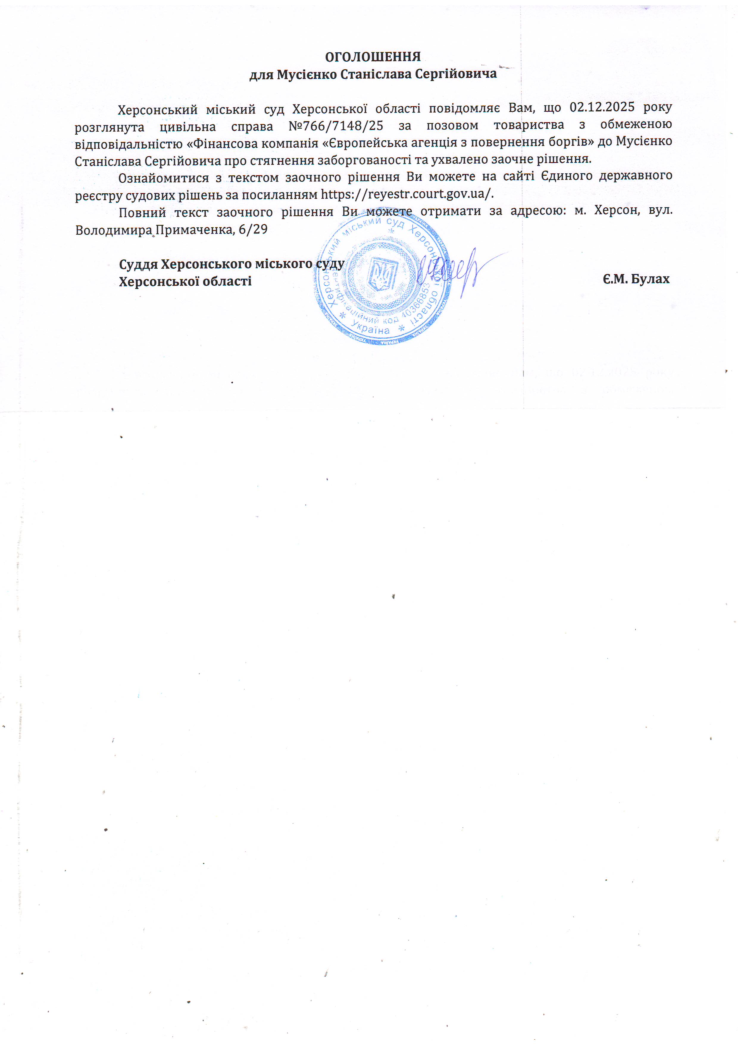Оголошення для Мусієнка Станіслава Сергійовича про ухвалення заочного рішення