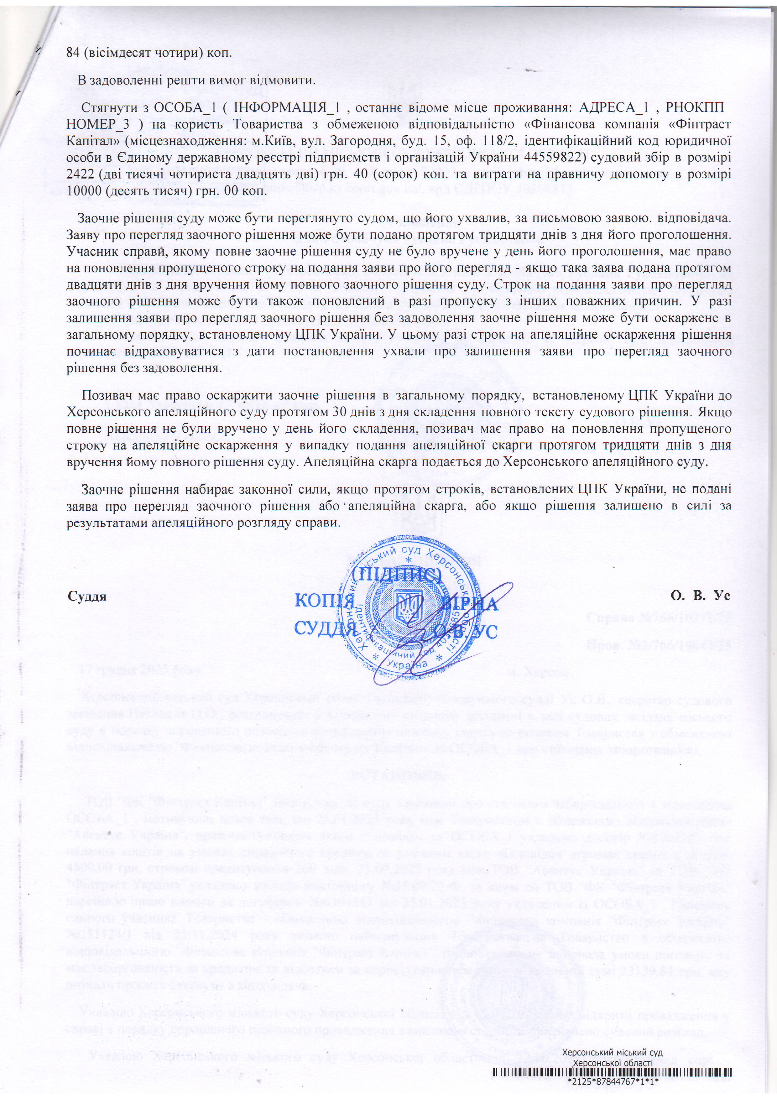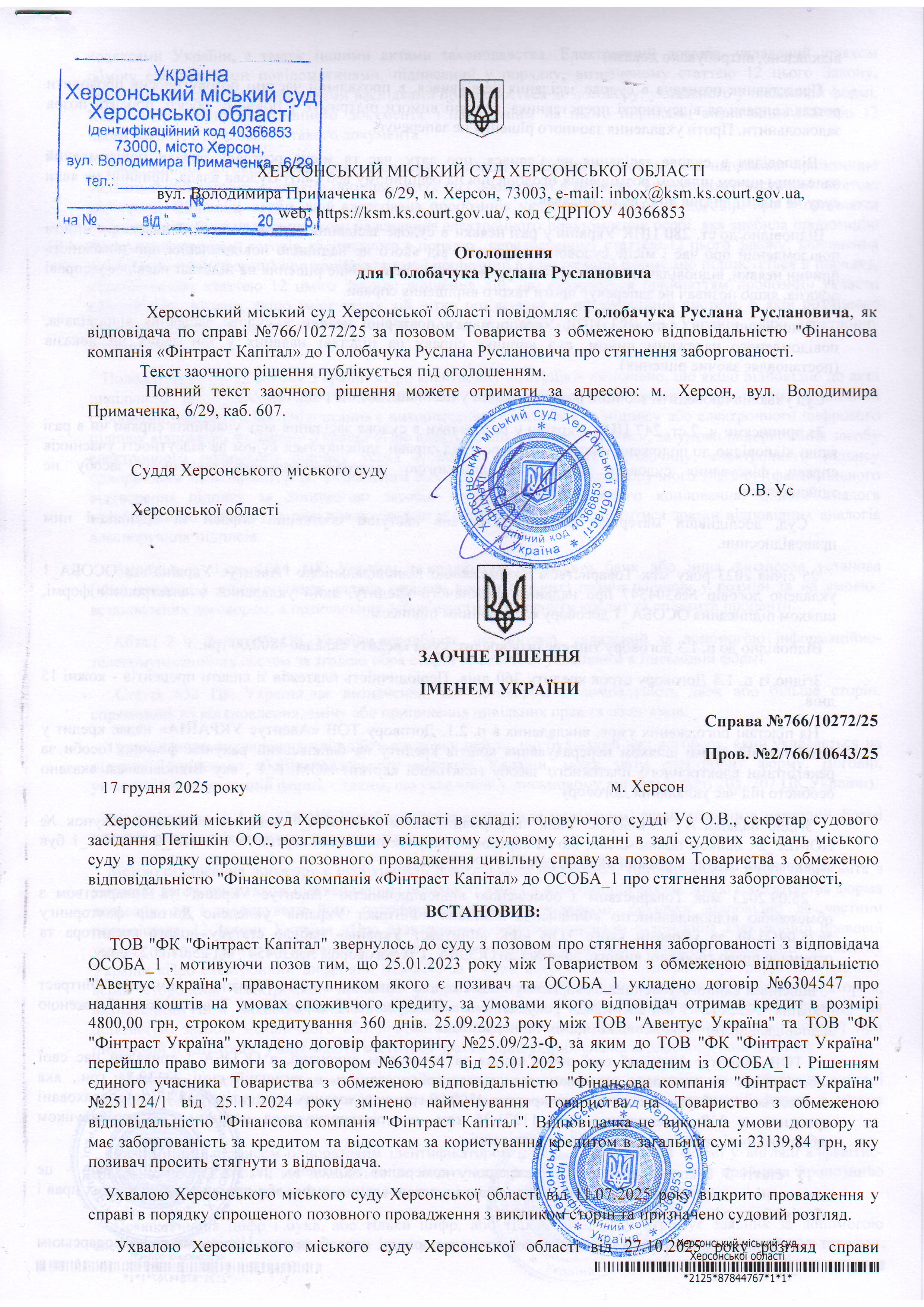 ОГОЛОШЕННЯ, УХВАЛИ ТА ЗАОЧНІ РІШЕННЯ