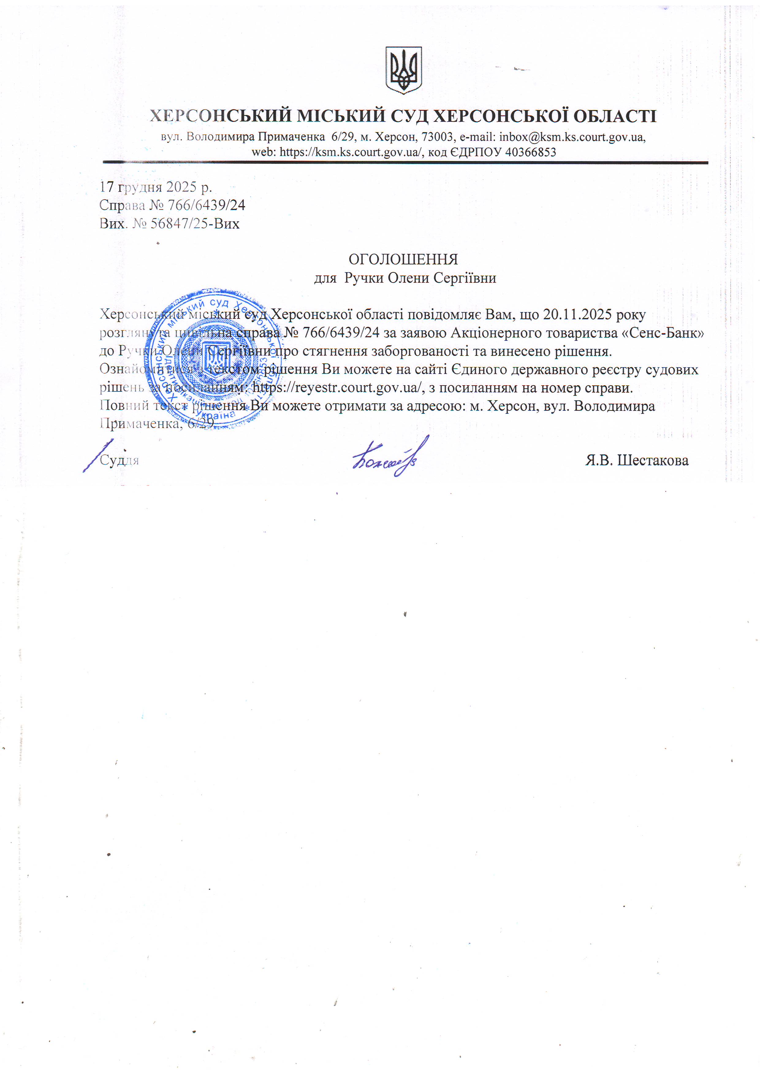 Оголошення для Ручки Олени Сергіївни про винесення рішення