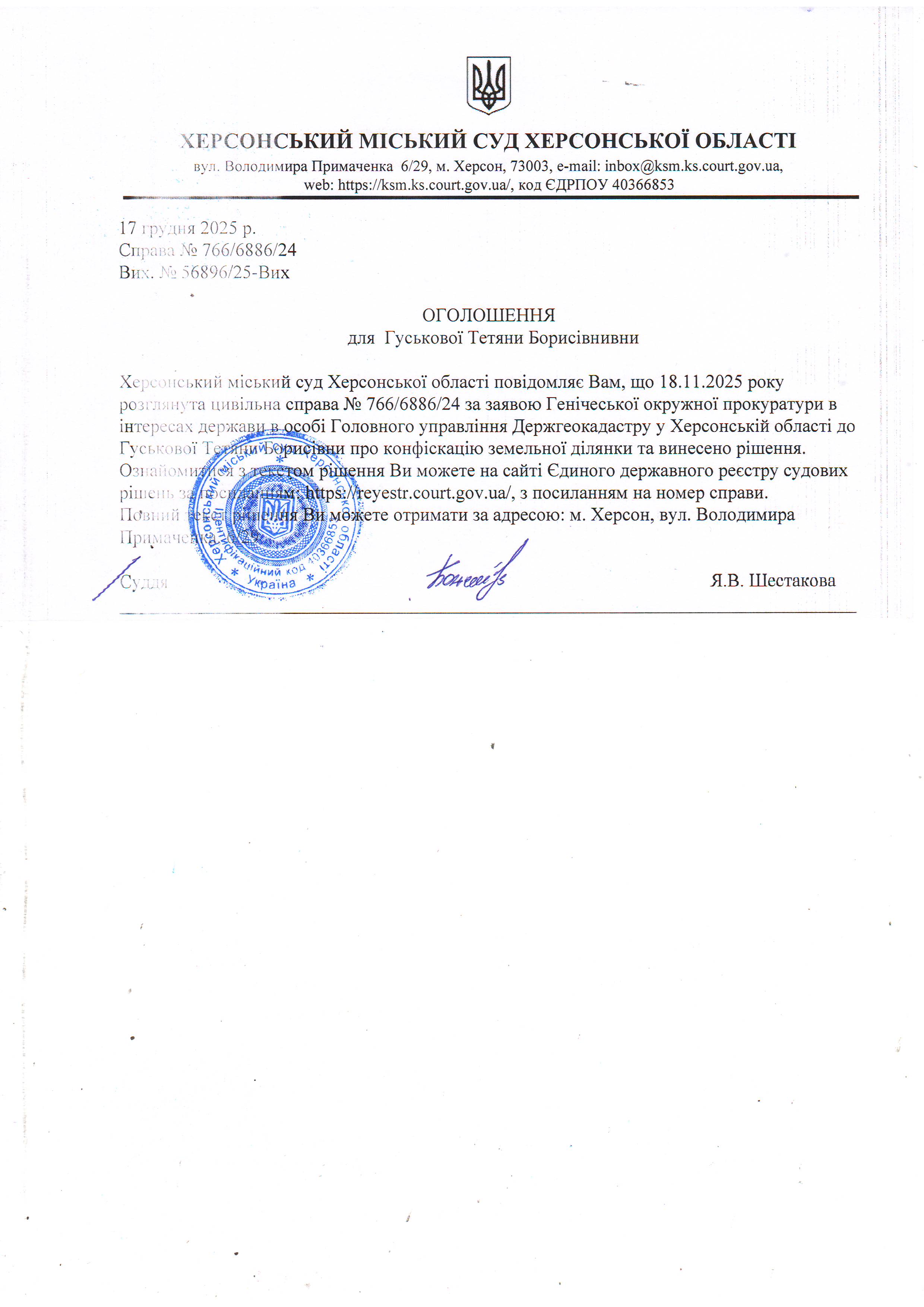 Оголошення для Гуськової Тетяни Борисівни про винесення рішення