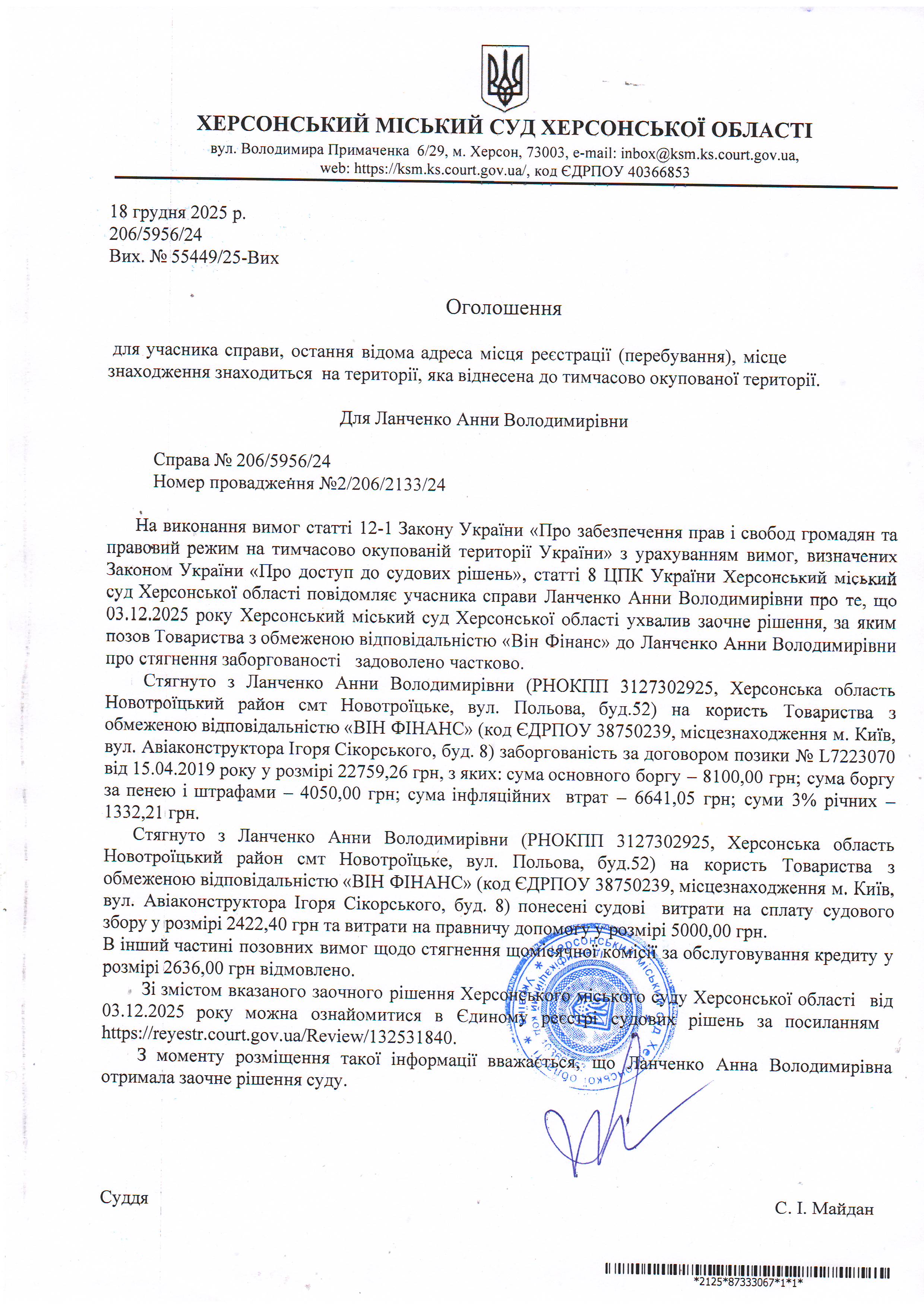 Оголошення про виклик особи в суд та повідомлення про судове рішення