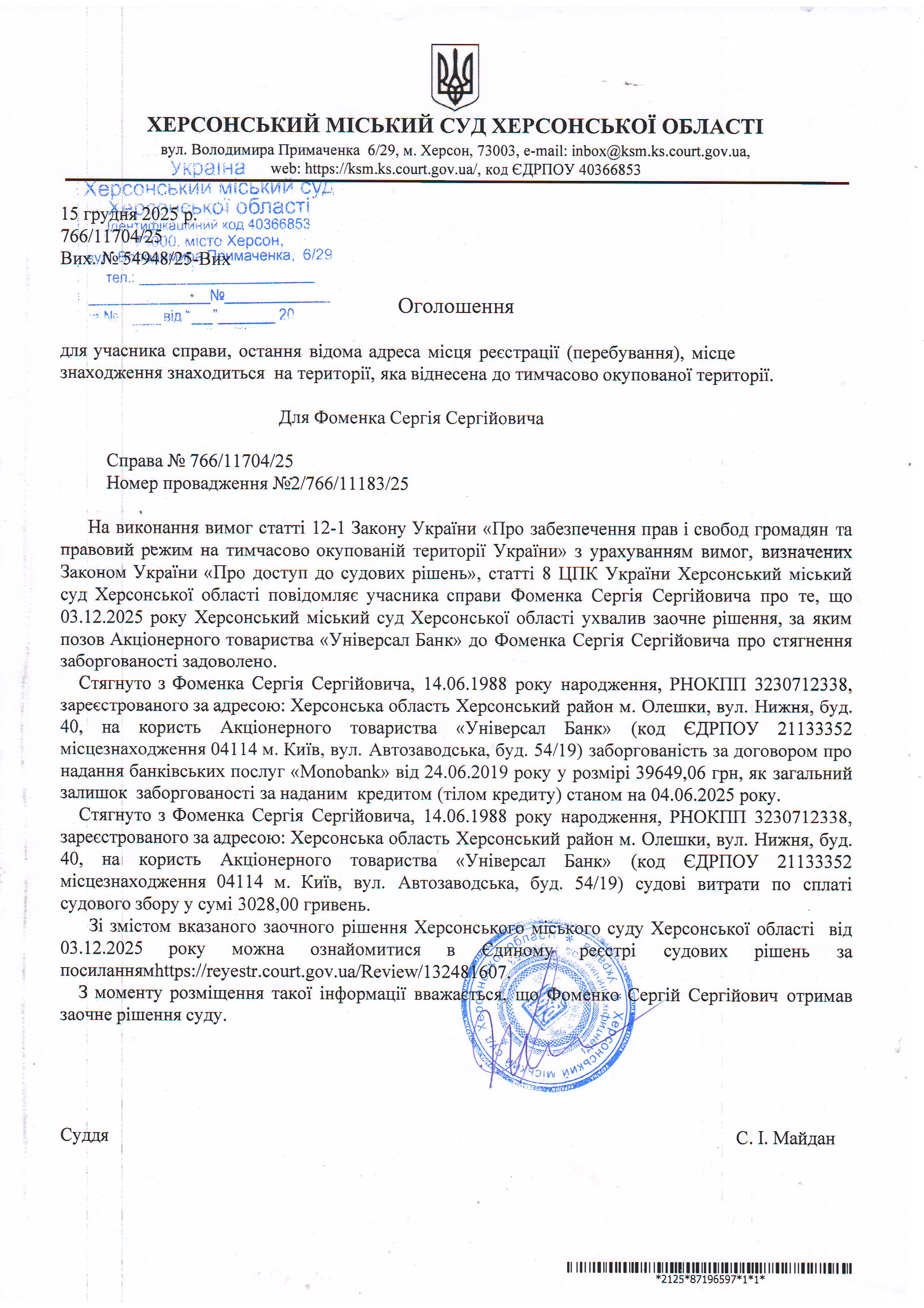 Оголошення для Фоменка Сергія Сергійовича про ухвалення заочного рішення