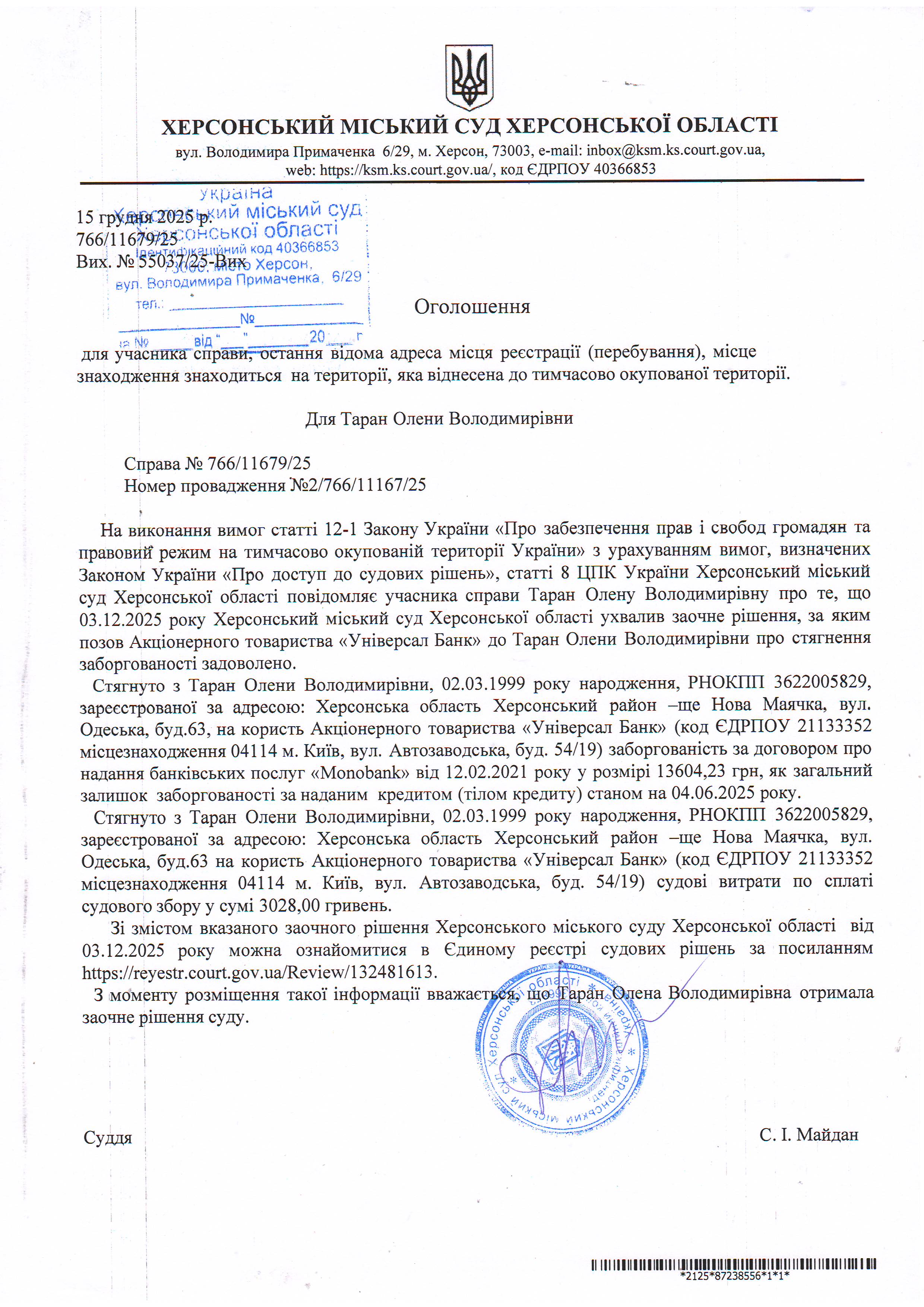 Оголошення для Таран Олени Володимирівни про ухвалення заочного рішення
