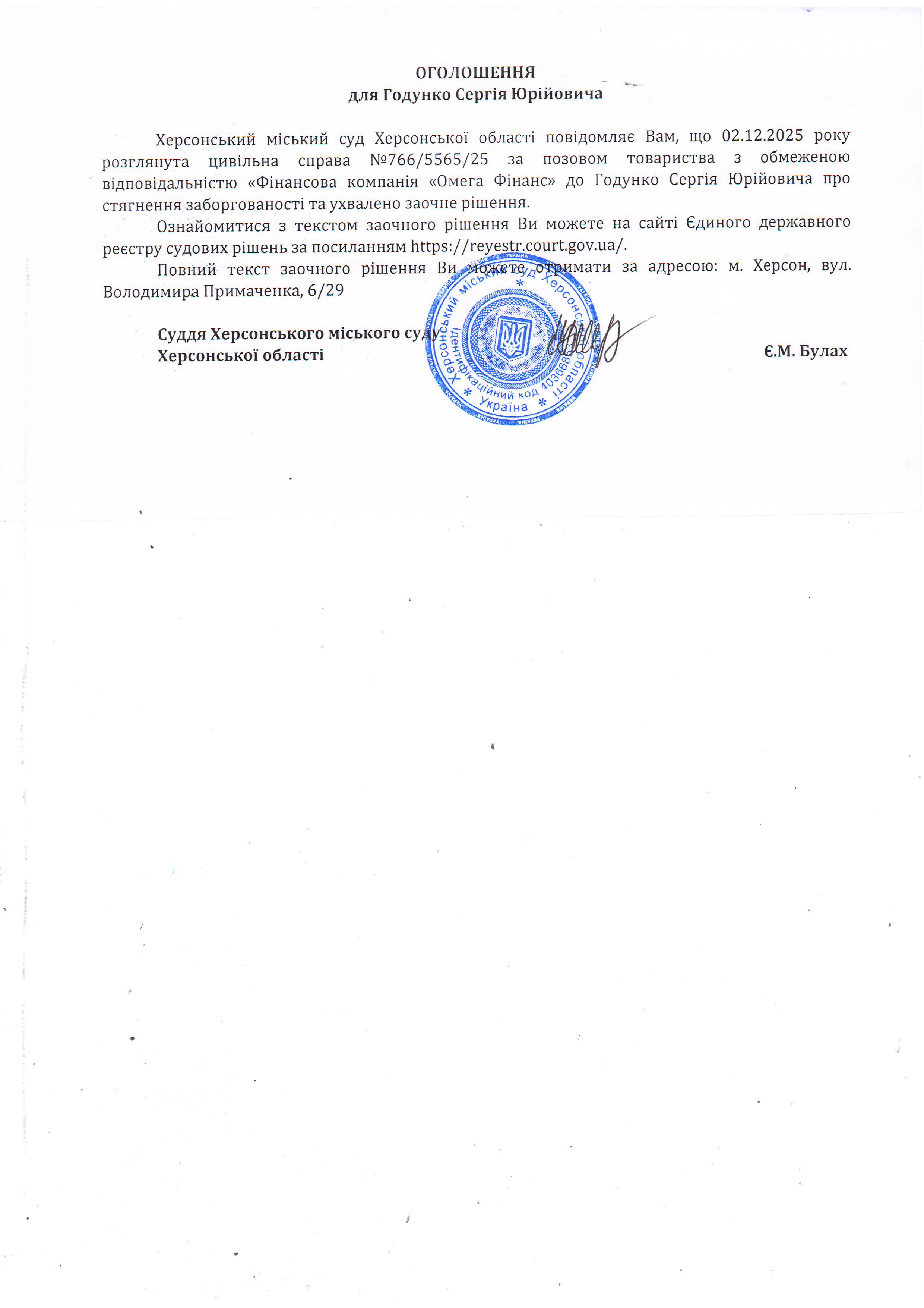 Оголошення для Годунка Сергія Юрійовича про ухвалення заочного рішення