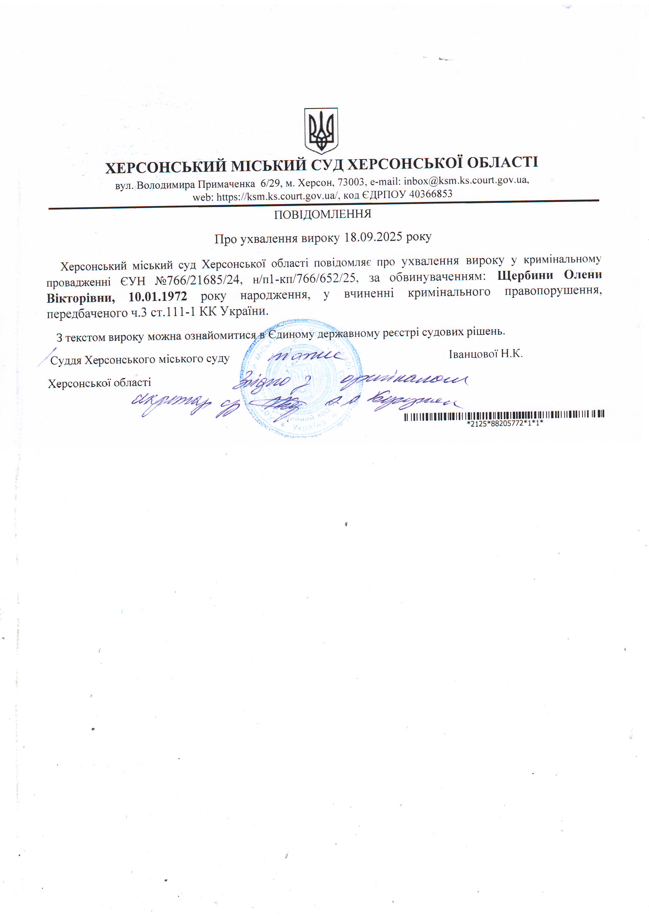 Оголошення для Щербини Олени Вікторівни про ухвалення вироку
