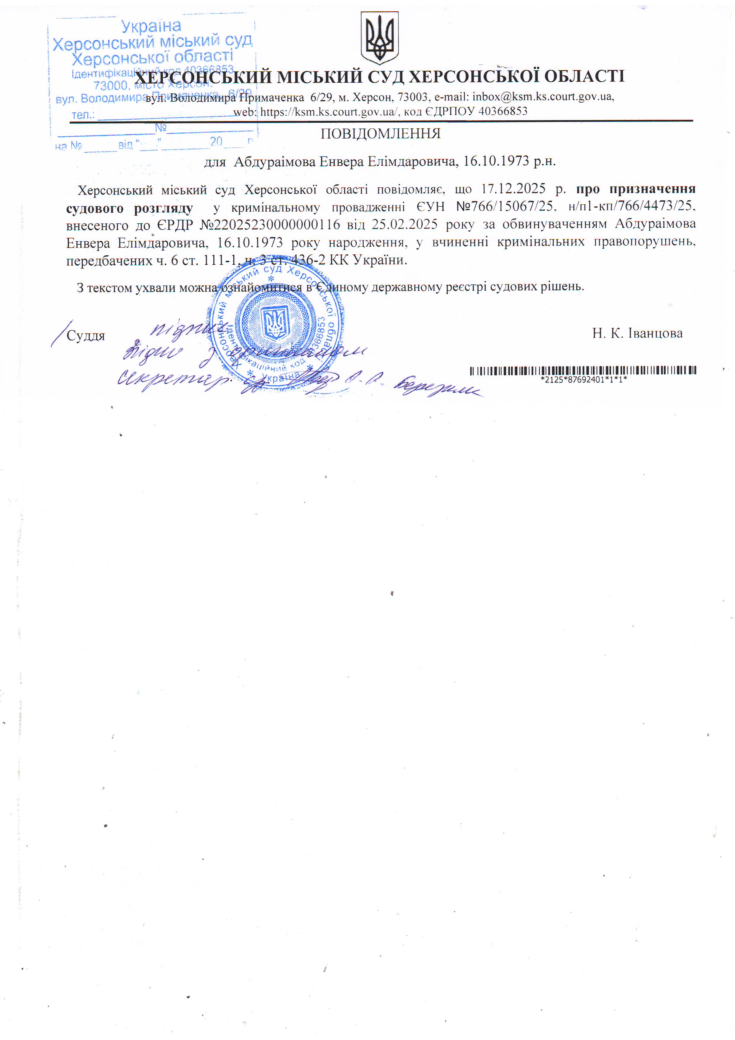 Оголошення для Абдураімова Енвера Елімдаровича про призначення судового розгляду
