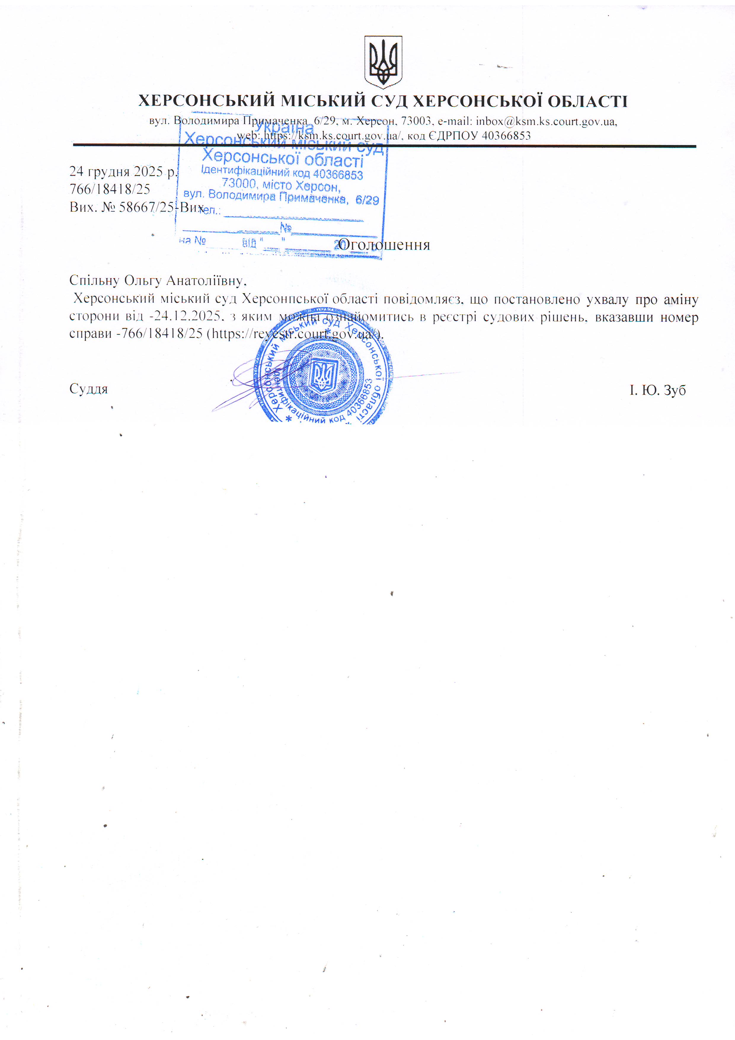 Оголошення для Спільної Ольги Анатоліївни про постановлення ухвали