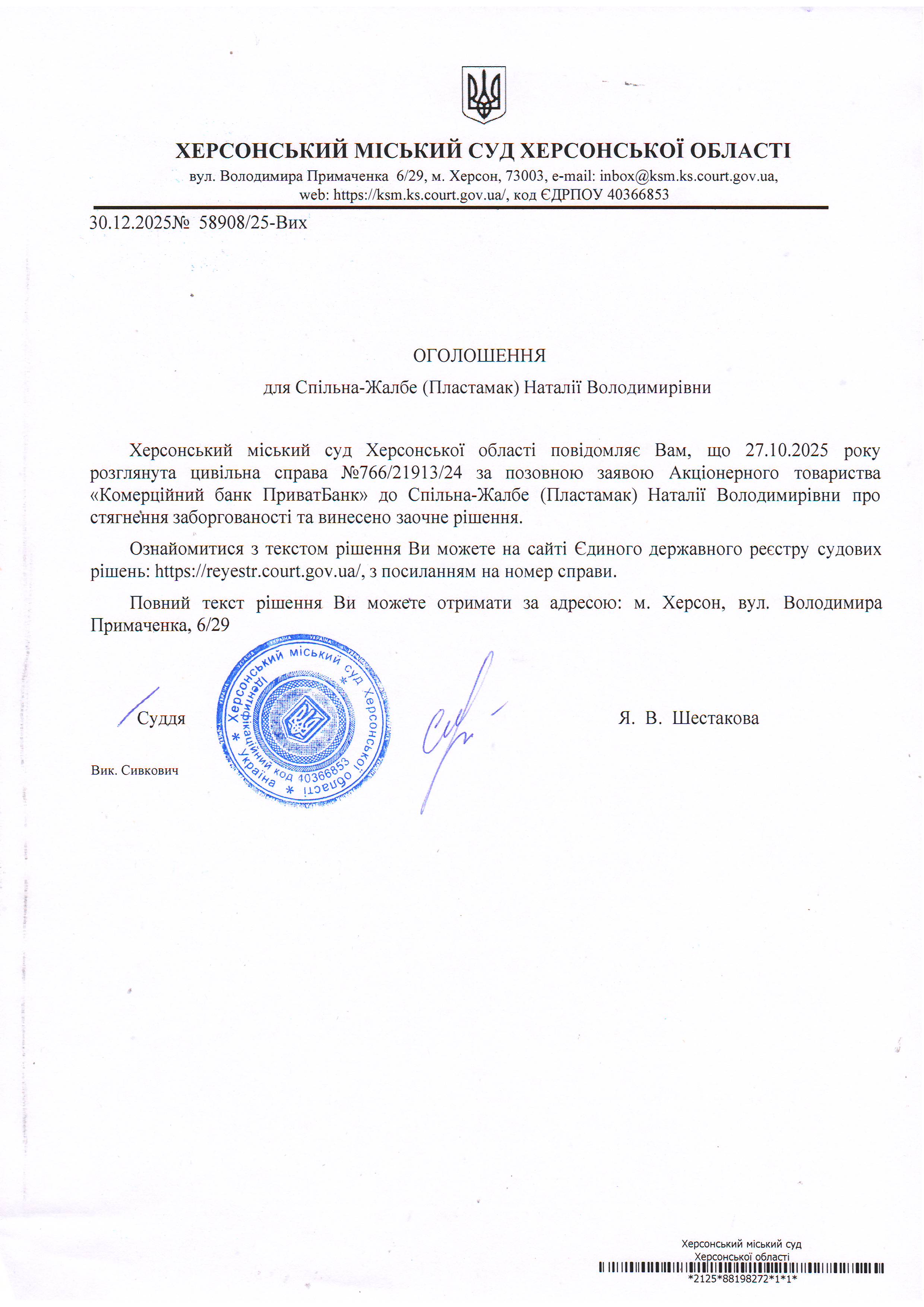 Оголошення для Спільна-Жалбе (Пластмак) Наталії Володимирівни про винесення заочного рішення