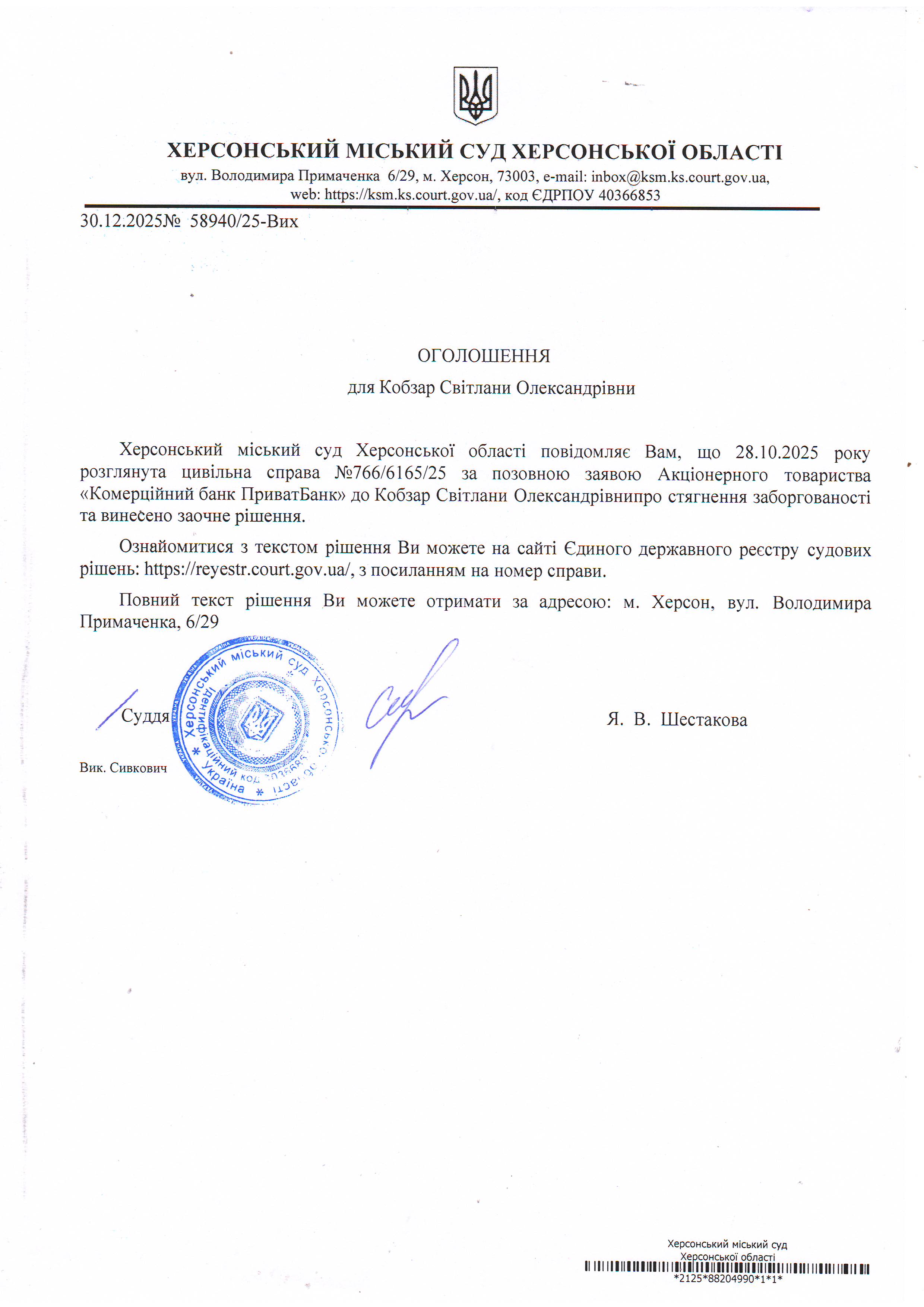 Оголошення для Кобзар Світлани Олександрівни про винесення заочного рішення