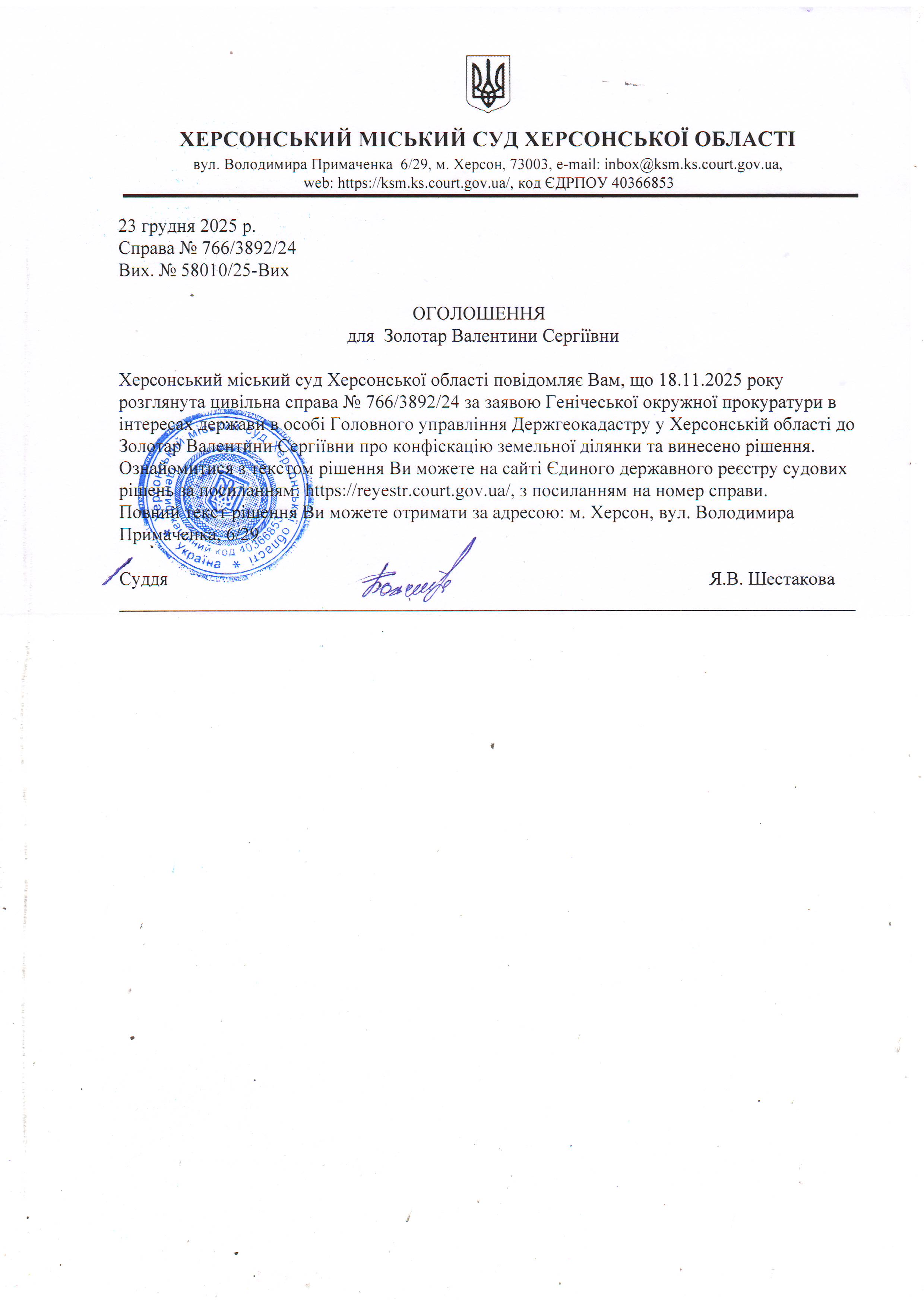 Оголошення для Золотар Валентини Сергіївни про винесення рішення