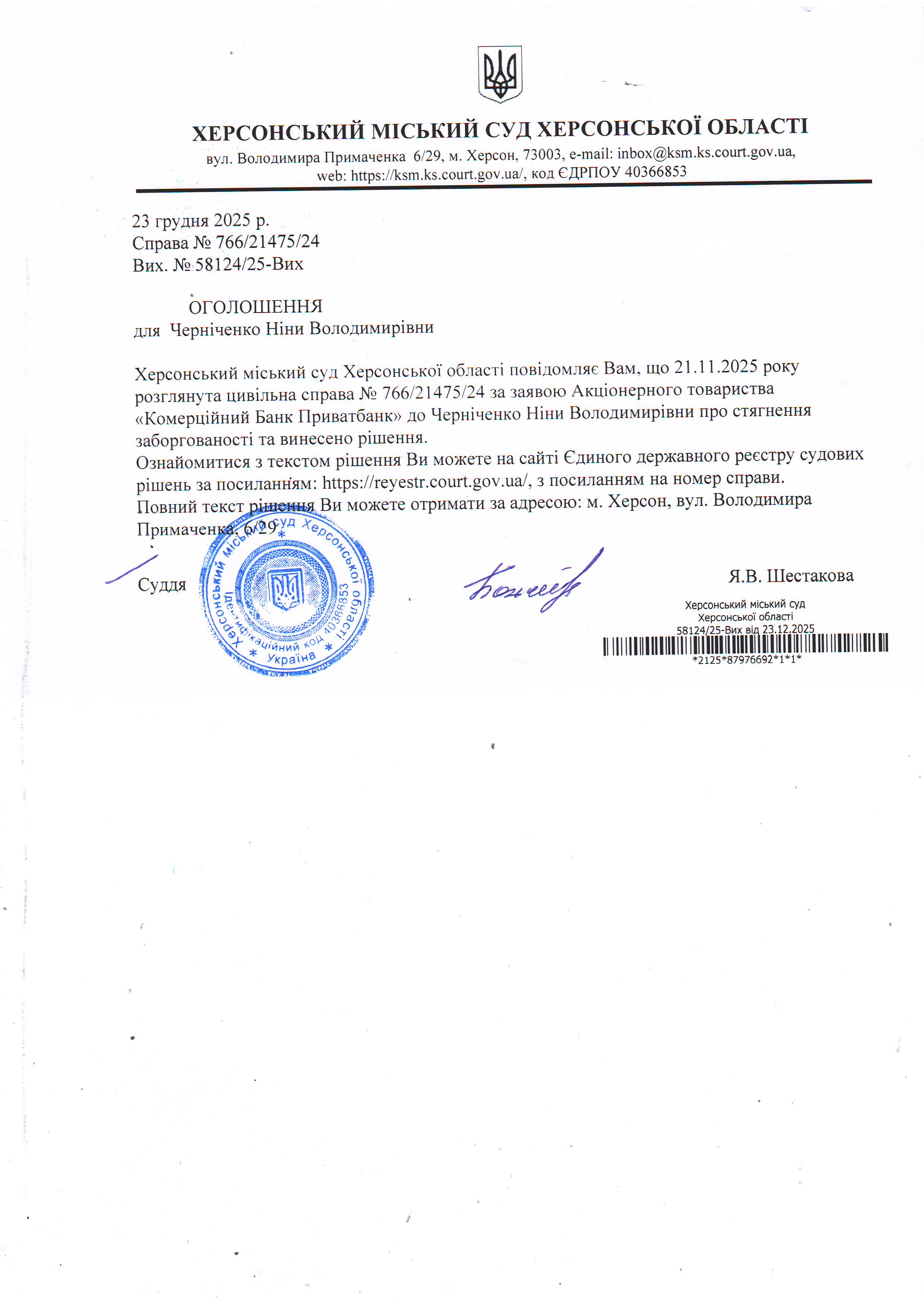 Оголошення для Черніченко Ніни Володимирівни про винесення рішення