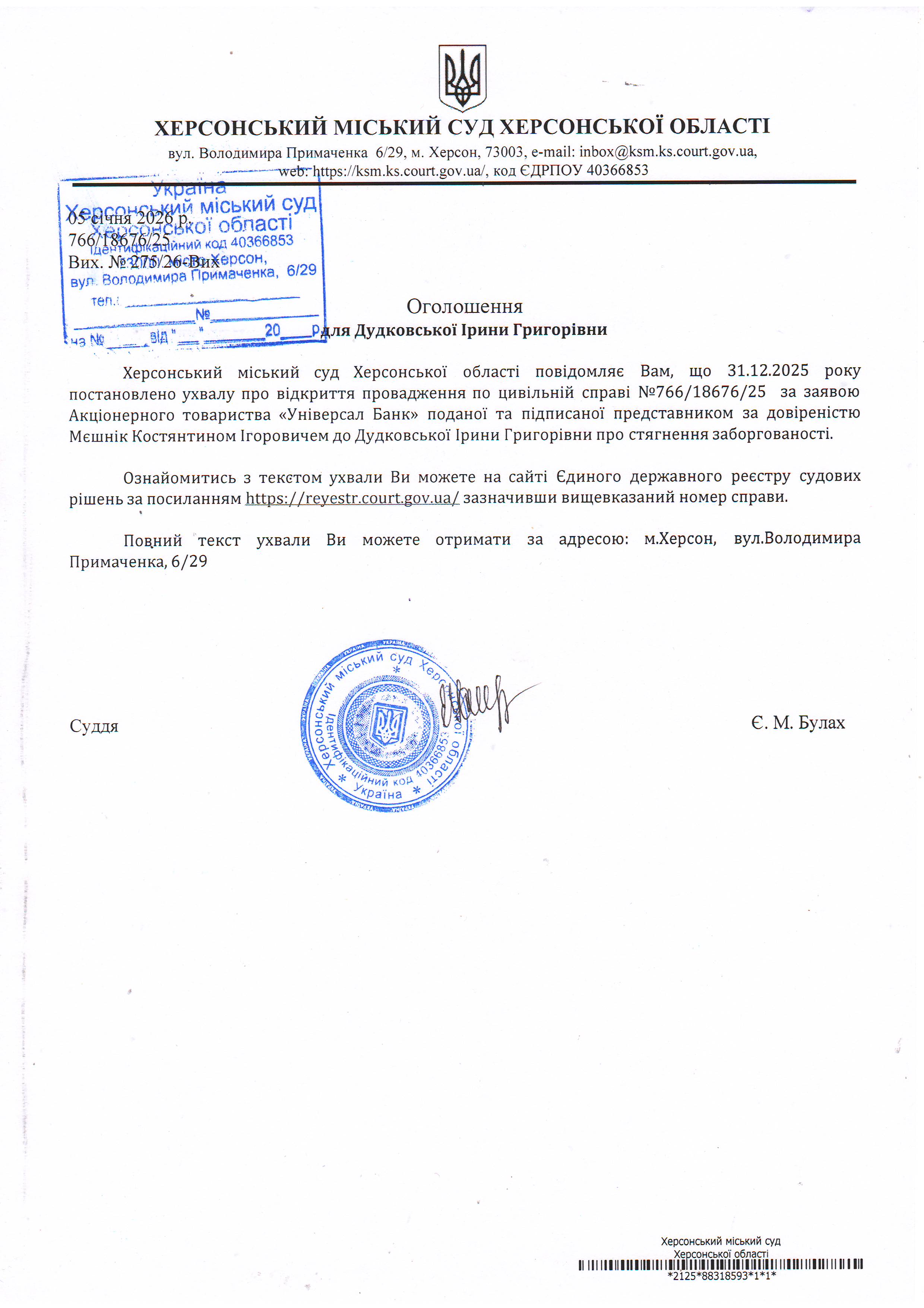 Оголошення для Дудковської Ірини Григорівни про постановлення ухвали