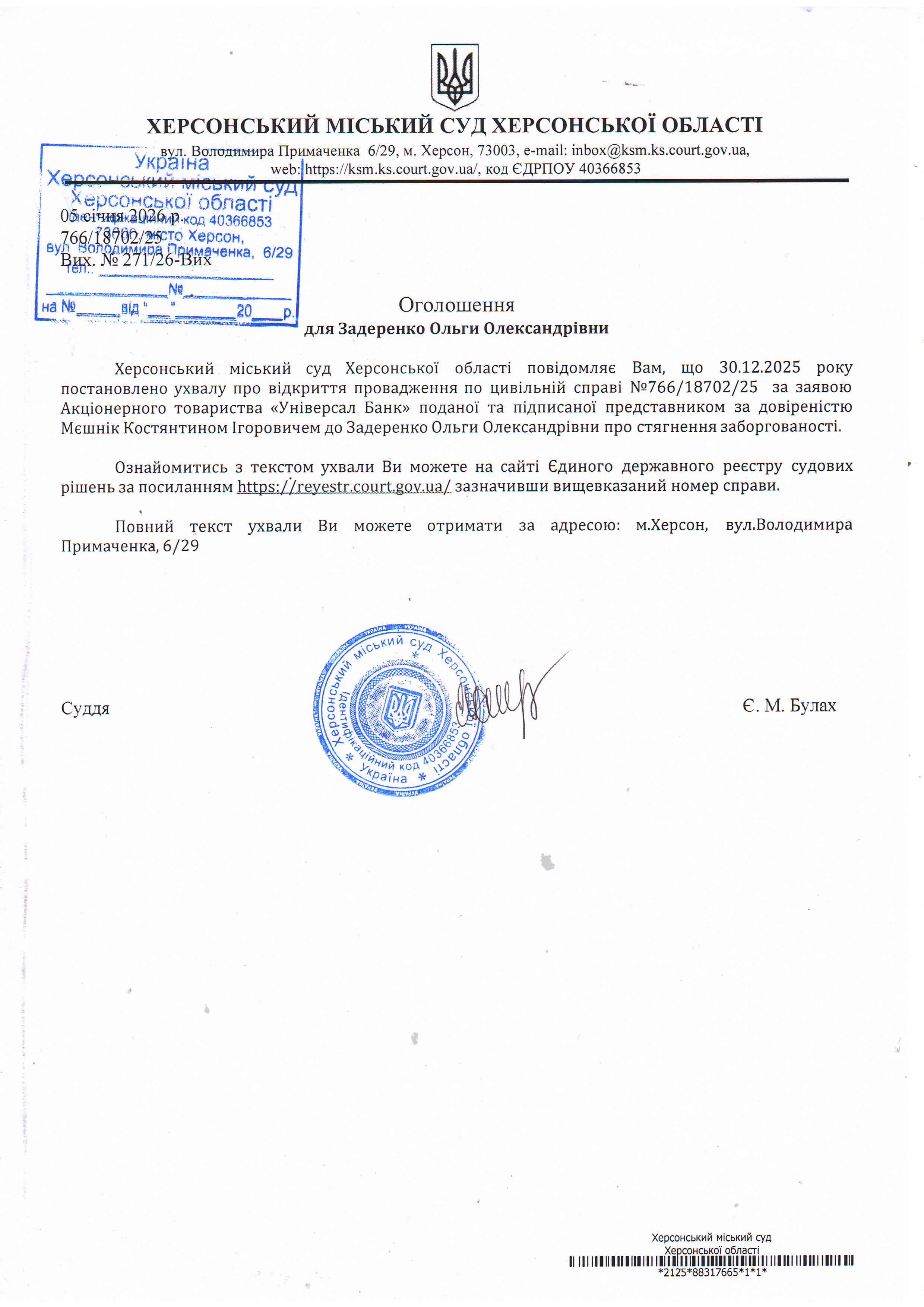 Оголошення для Задеренко Ольги Олександрівни про постанвлення ухвали