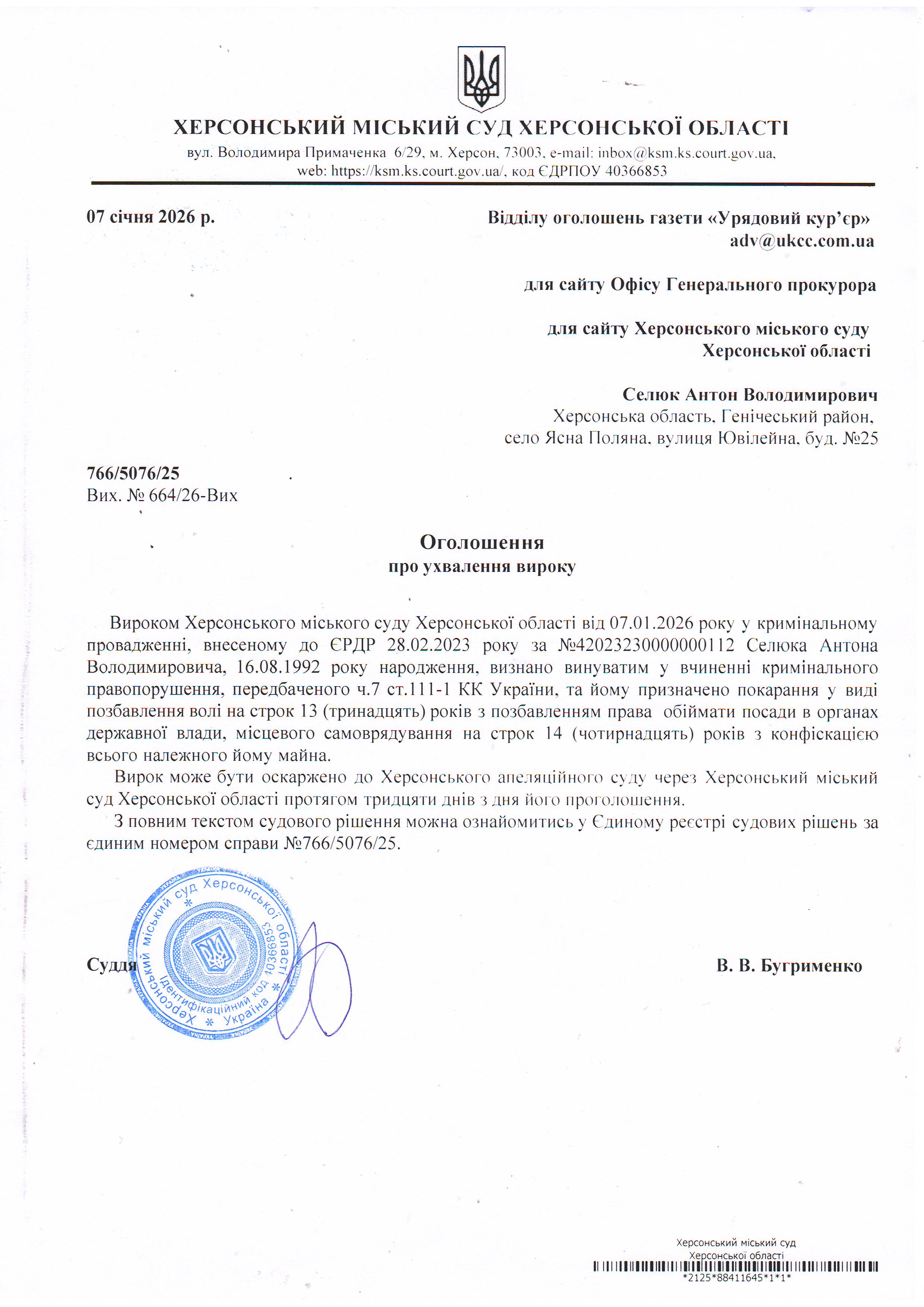 Оголошення для Селюка Антона Володимировича про ухвалення вироку