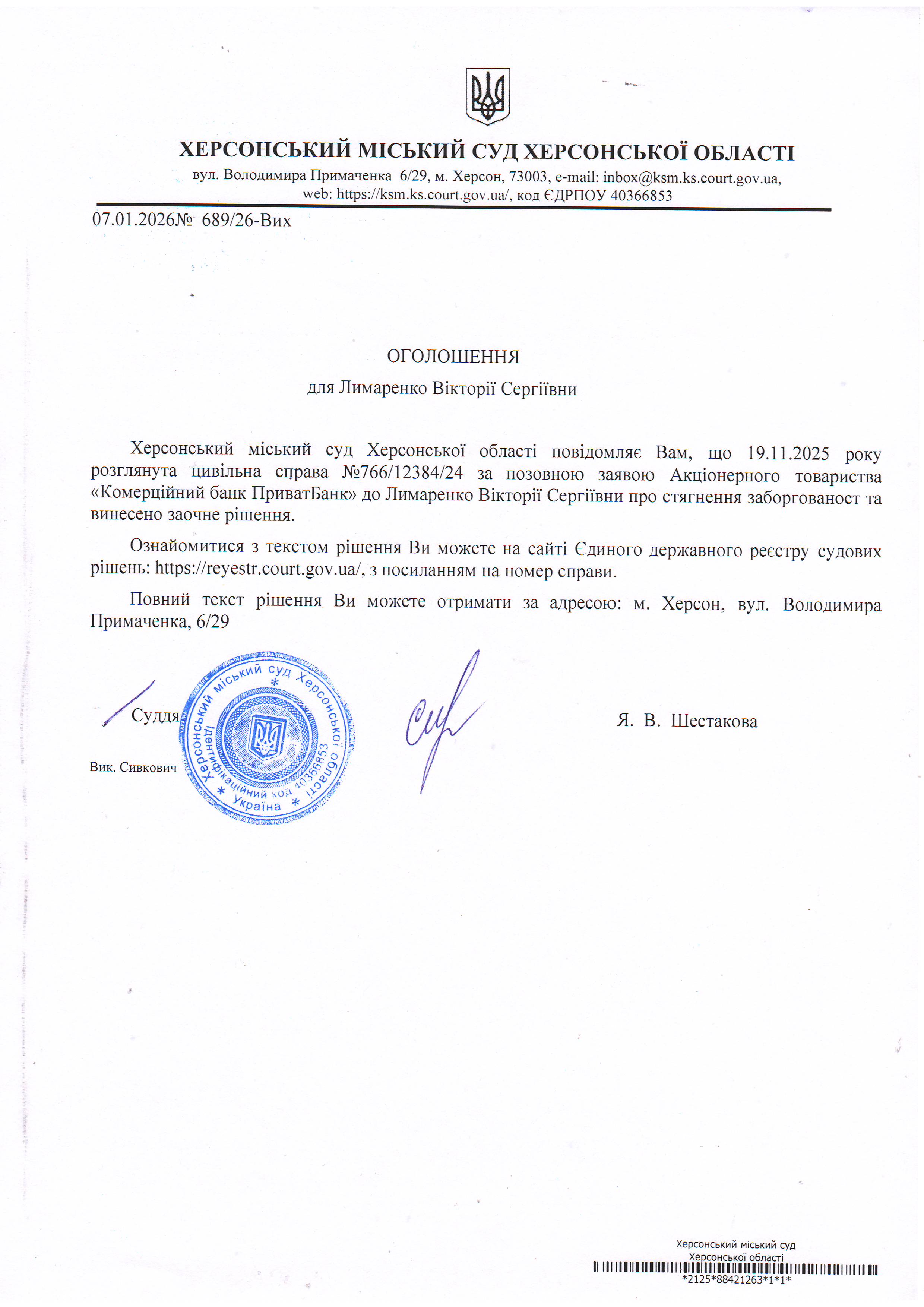 Оголошення для Лимаренко Вікторії Сергіївни про винесення заочного рішення