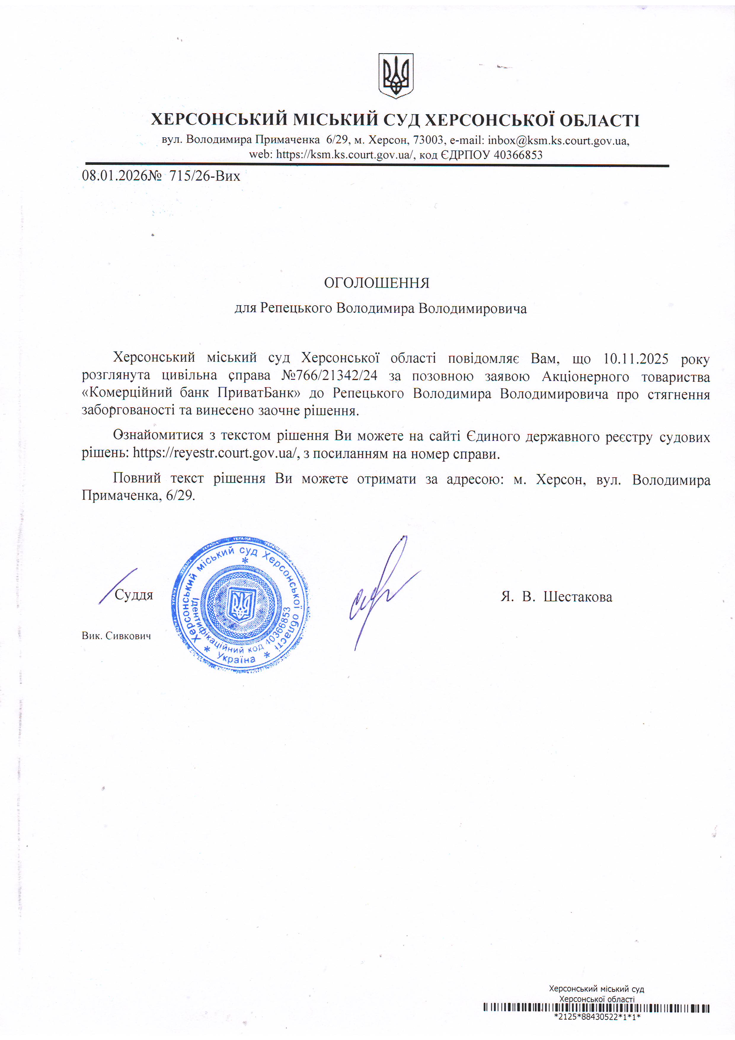 Оголошення для Репецького Володимира Володимировича про винесення заочного рішення